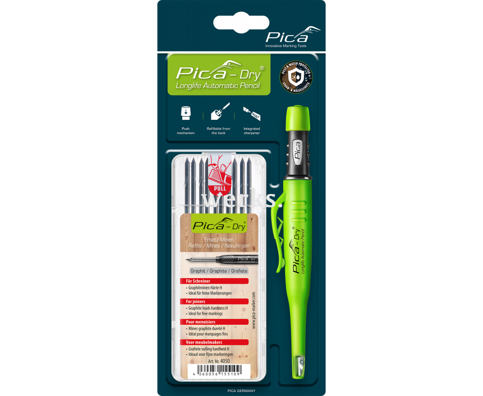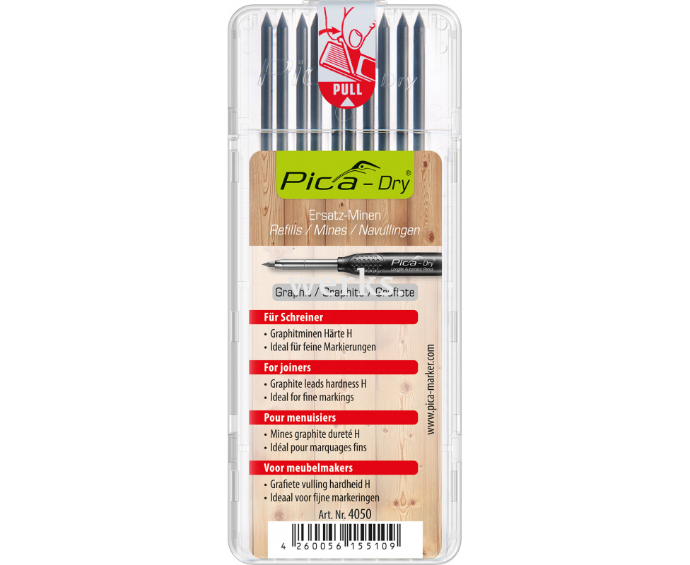 Комплект, состоящий из карандаша Pica-Dry (3030) и десяти графитовых стержней Pica (4050) 30405, идеально подходит для точной разметки на сухих поверхностях. Для удаления с гладких поверхностей достаточно использовать влажную салфетку. Графитовые стержни имеют твердость H.
