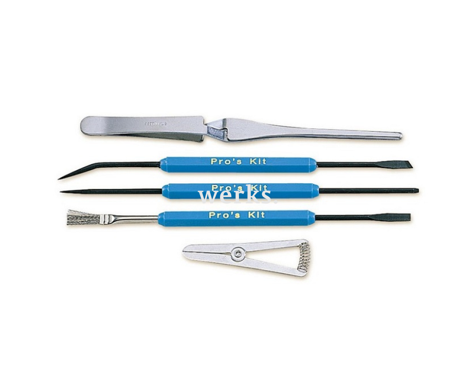 В комплекте из пяти предметов присутствуют теплоотвод для защиты от перегрева, нож, щеточка, скребок, крюк, вилочный захват и острый зонд. Упакованы в картонную коробку. Вес - 98,2 г. Эти специализированные инструменты для пайки делают работу как профессионалов, так и домашних мастеров более удобной.
