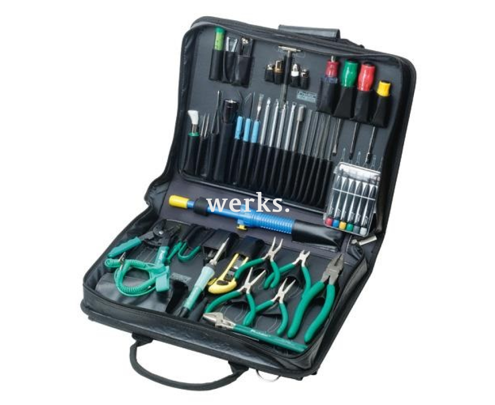 Профессиональный набор инструментов, необходимый для выполнения электромонтажных работ и обслуживания электротехники. Комплект поставляется в прочной и легкой сумке-кейсе из полиэстера с молнией. Состав набора: - 1PK-108T Пинцет обратного действия; - 1PK-125T Пинцет с заостренным концом; - 8PK-154 Щетка; - 8PK-3161 Кримпер; - 908-609 Экстрактор для микросхем; - PD-610 Экстрактор для PLCC микросхем; - 9110 Набор инструментов для продукции Apple; - 89402A Отвертка шлицевая Pro-soft 5,0x75 мм; - 89402B Отвертка крестовая Pro-soft PH1x75 мм; - 19400-M5/9408 Отвертка торцевая HEX Pro-soft 5 мм; - AS-611 Антистатический браслет; - DK-2039 Универсальный нож с 3 лезвиями; - 9FL-507 Фонарик; - 9H002/9H002A Набор шестигранных ключей (7 шт.); - 9H003 Трехпалый захват; - 1PK-H028 Разводной ключ 8 дюймов; - 9HAM-3 Набор молоточков (6 частей); - 8PK-605A Набор надфилей (5 шт.); - 1PK-036S Длинногубцы 135 мм; - 1PK-037S Диагональные кусачки 110 мм; - 1PK-051 Пассатижи 210 мм; - 1PK-054S Плоскогубцы 135 мм; - 1PK-055S Плоскогубцы с загнутыми губками 130 мм; - 8PK-2061 Набор отверток для электроники (6 шт.); - DP-366P Оловоотсос; - SI-130B-20 Паяльник; - 9S001 Припой; - 9S002A/B/C Вспомогательные инструменты для пайки (3 шт.); - 9S004 Флюс (теплоотвод); - 9SD045AN Двусторонняя бита SL 4 мм / T6; - 9SD045C Двусторонняя бита PH1 / PH2; - 9SD045DN Двусторонняя бита SL6 мм / T8; - 9SD045E Двусторонняя бита T10 / T15; - 9SD045J Удлинитель 175 мм. Размер кейса - 435x325x90 мм. Вес - 5400 г. Этот профессиональный набор инструментов идеально подходит для электромонтажных работ, обслуживания электротехники, электропроводки и ремонта компьютеров, включая продукцию Apple.