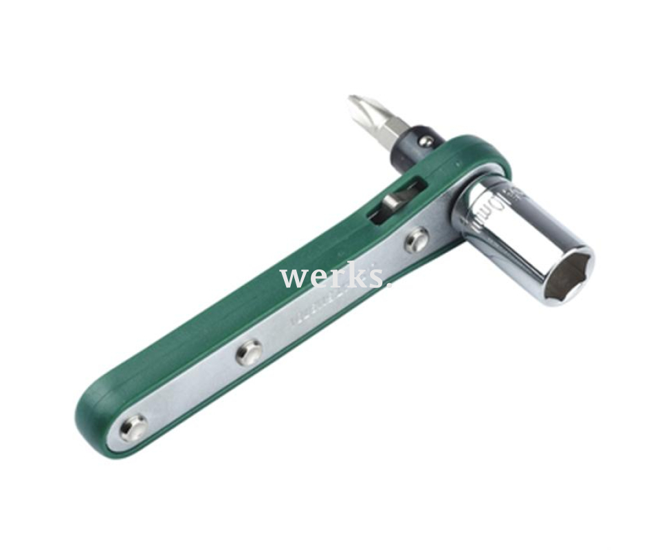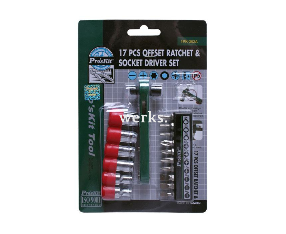 В комплект Pro'sKit 1PK-201 входят реверсивная трещотка и 17 сменных бит и торцевых головок, предназначенных для основных типов шлицев. Биты изготовлены из высокопрочной хромванадиевой стали. Поставляется в блистерной упаковке. Типы шлицев: - SL (4, 5, 6), - PH (PH 1, PH 2), - PZ (PZ1, PZ2), - TORX (T-10, T-15, T-20), - головки HEX NUT (5, 6, 7, 8, 9, 10). Вес - 244 г. Комплект подходит для общих ремонтных и слесарно-монтажных работ, а также для обслуживания автотехники и выполнения задач в строительстве, дерево- и металлообработке.