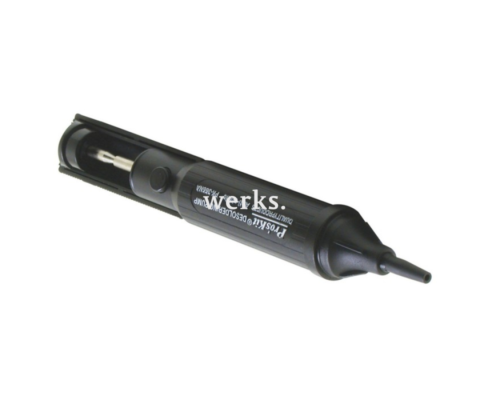 Мощный поршневой оловоотсос с вакуумным всасыванием. Благодаря двойным уплотнительным кольцам поршня исключается утечка воздуха, что усиливает эффективность всасывания. Сменное жало изготовлено из термостойкого тефлона. Корпус выполнен из полимерного пластика с нескользящей поверхностью. Пружина поршня изготовлена из нержавеющей стали. Поставляется в блистерной упаковке. Сменное жало - ProsKit 5PK-366NA-T. Длина инструмента - 210 мм. Вес - 85 г. Инструмент предназначен для удаления излишков припоя. Антистатический, идеально подходит для очистки печатных плат в процессе пайки или ремонта.