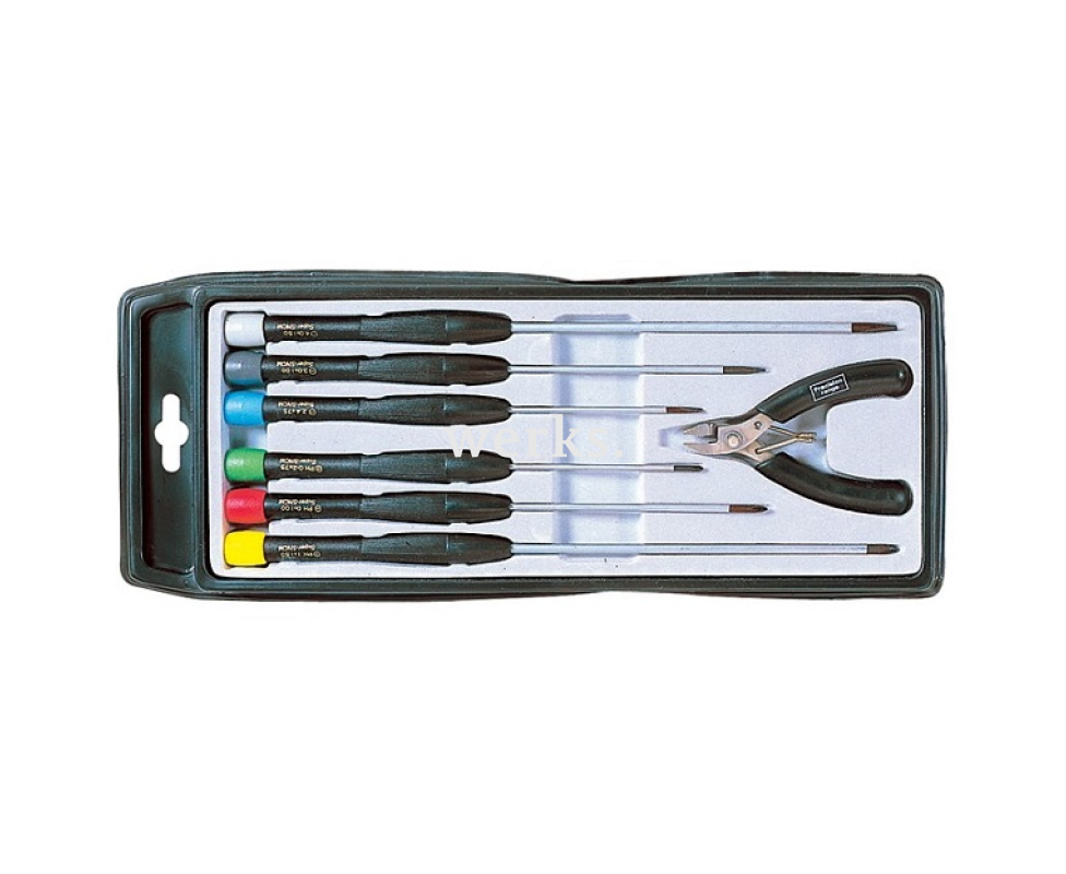 Профессиональный комплект из 6 прецизионных отверток и нержавеющих антистатических микрокусачек, предназначенный для работы в области электроники и точной механики. Упакован в пластиковый кейс. Размеры отверток: - Прецизионная шлицевая отвертка 2.4x75 мм; - Прецизионная шлицевая отвертка 3.0x100 мм; - Прецизионная шлицевая отвертка 4.0x150 мм; - Крестовая отвертка PH0-2x75 мм; - Крестовая отвертка PH0x100 мм; - Крестовая отвертка PH1x150 мм. Вес - 236 г. Профессиональный набор инструментов для работы с электроникой и точной механикой.