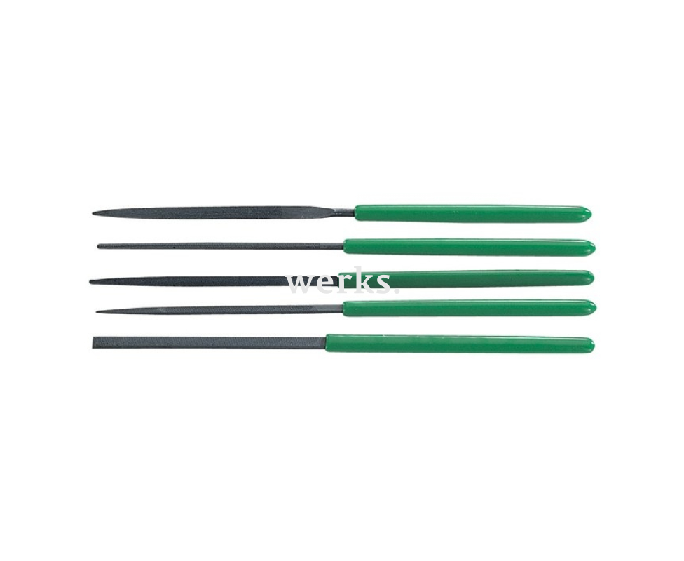 Набор из пяти миниатюрных надфилей с различными профилями и рукоятками, покрытыми ПВХ-изоляцией. Поставляется в удобном чехле. Длина инструмента составляет 170 (±3) мм. Длина рабочей части равна 75 мм. Вес инструмента - 56,8 (±3) г. Эти надфили идеально подходят для точной обработки, особенно в условиях ограниченного пространства.