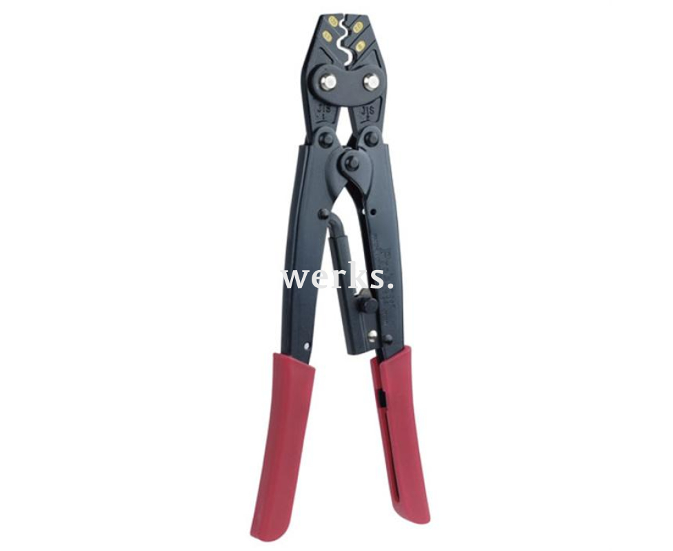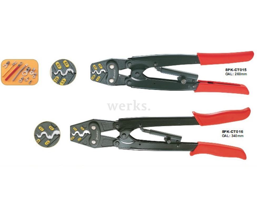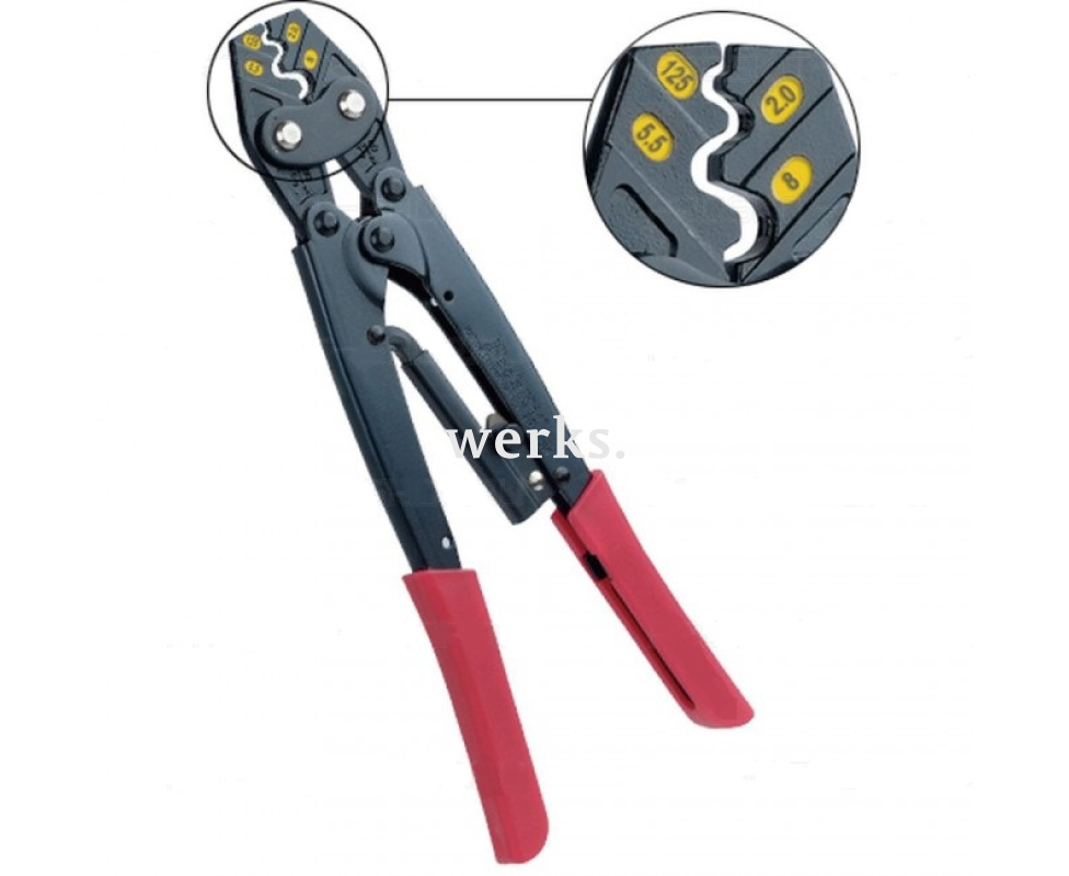 Инструмент предназначен для обжима неизолированных гаечных клемм. Удобные рукоятки с покрытием из ПВХ. Корпус выполнен из среднеуглеродистой стали S45C с чернением, а головка изготовлена из стали SK-5. Оснащен храповым механизмом, который значительно упрощает процесс работы. Поставляется в блистерной упаковке. Товар доступен для заказа только из наличия на складе, по предзаказу не поставляется. Длина инструмента - 260 мм. Вес - 480 г. Кримпер предназначен для опрессовки неизолированных гаечных клемм AWG: 12-10, 8, 6; JIS: 1.25, 2.0, 5.5, 8.0 мм²; DIN: 1.5, 2.5, 6, 10 мм².