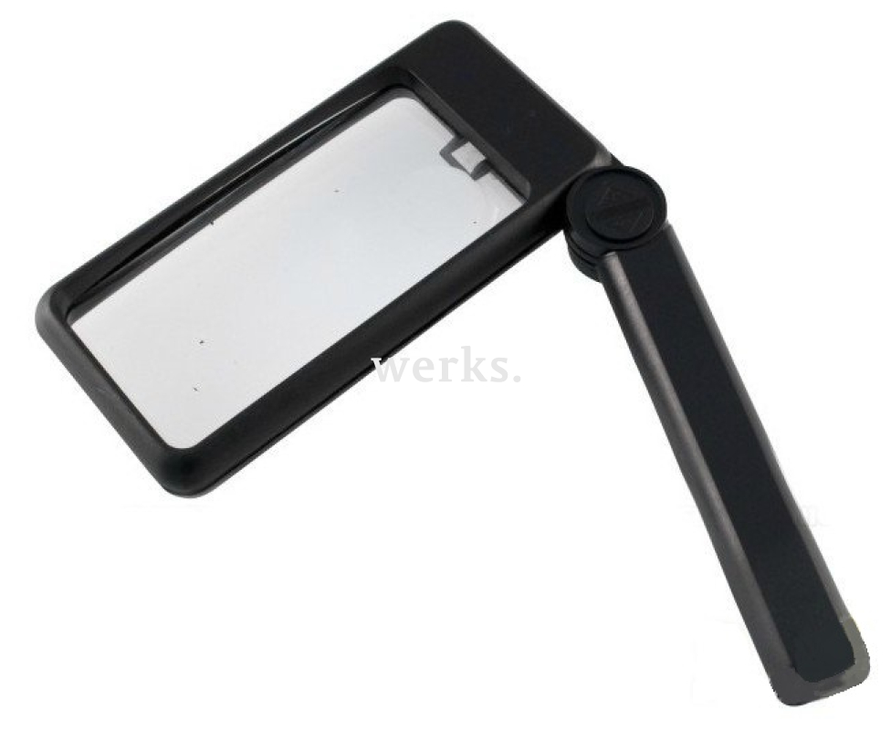Складная лупа с акриловой линзой и LED-подсветкой. Упакована в блистер. Длина ручки - 10 см. Размер линзы - 96х49 мм. Увеличение - 2Х, 4Х. Питание - 2 батареи AAA 1,5 В. Вес - 124 г. Отлично подходит для чтения мелкого текста при плохом освещении, а также для проверки качества пайки.