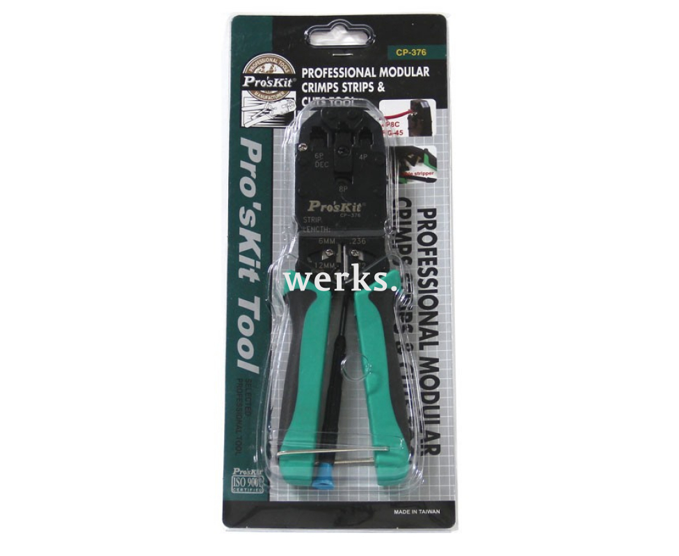 Инструмент с интегрированным стриппером для круглых кабелей, который позволяет выполнить зачистку за один шаг. Он осуществляет резку, зачистку и обжим модульных разъемов без необходимости менять насадки. Двухкомпонентные ручки выполнены из полипропилена и термопластичной резины. Корпус изготовлен из среднеуглеродистой стали S45C с чернением и твердостью 45°±3° HRC. Храповый механизм значительно упрощает процесс работы. Поставляется в блистерной упаковке. Длина инструмента - 205 мм. Вес - 571 г. Применяется для параллельной опрессовки одножильных и многожильных проводов, а также телефонных наконечников: 8P8C/RJ-45, 6P6C/RJ-12, 6P4C/RJ-11, 4P4C и 4P2C/RJ22. Встроенные кусачки и стриппер делают этот инструмент универсальным.