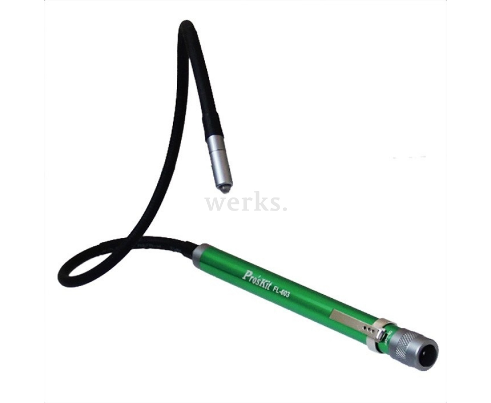 Корпус выполнен из анодированного алюминия, а гибкий удлинитель кабеля имеет длину 345 мм, что позволяет изгибать его под любым углом. Двусторонний выключатель обеспечивает возможность фиксирования фонарика в включенном состоянии. Используется светодиод белого света. Питание осуществляется от трех батареек ААА по 1,5 В. Световой поток составляет 11000 мкд. Диаметр ручки фонарика равен Ø15 мм, длина - 175 мм. Вес устройства составляет 115 г. Фонарик подходит для использования при ремонте автомобилей, в мастерских, а также в повседневных домашних задачах.