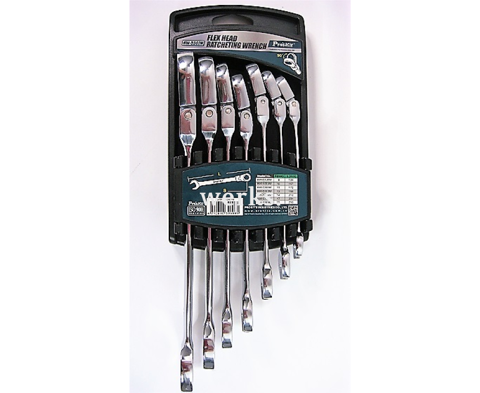 Набор гаечных ключей, состоящий из 7 элементов, выполнен из прочной среднеуглеродистой стали AISI 1045. Один конец ключа имеет открытый зев с углом наклона головки 15˚. На противоположном конце расположен накидной ключ с трещоткой и карданом. Размеры ключей, мм: 8х139, 10х157, 11х175, 13х194, 14х212, 17х231, 19х250. Вес набора составляет 1160 г. Этот набор идеально подходит для выполнения авторемонтных, монтажных, строительных и сантехнических работ.