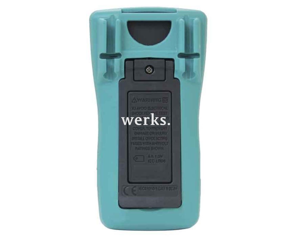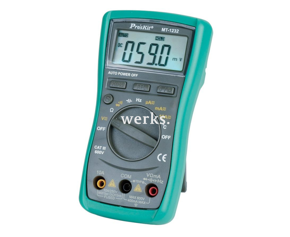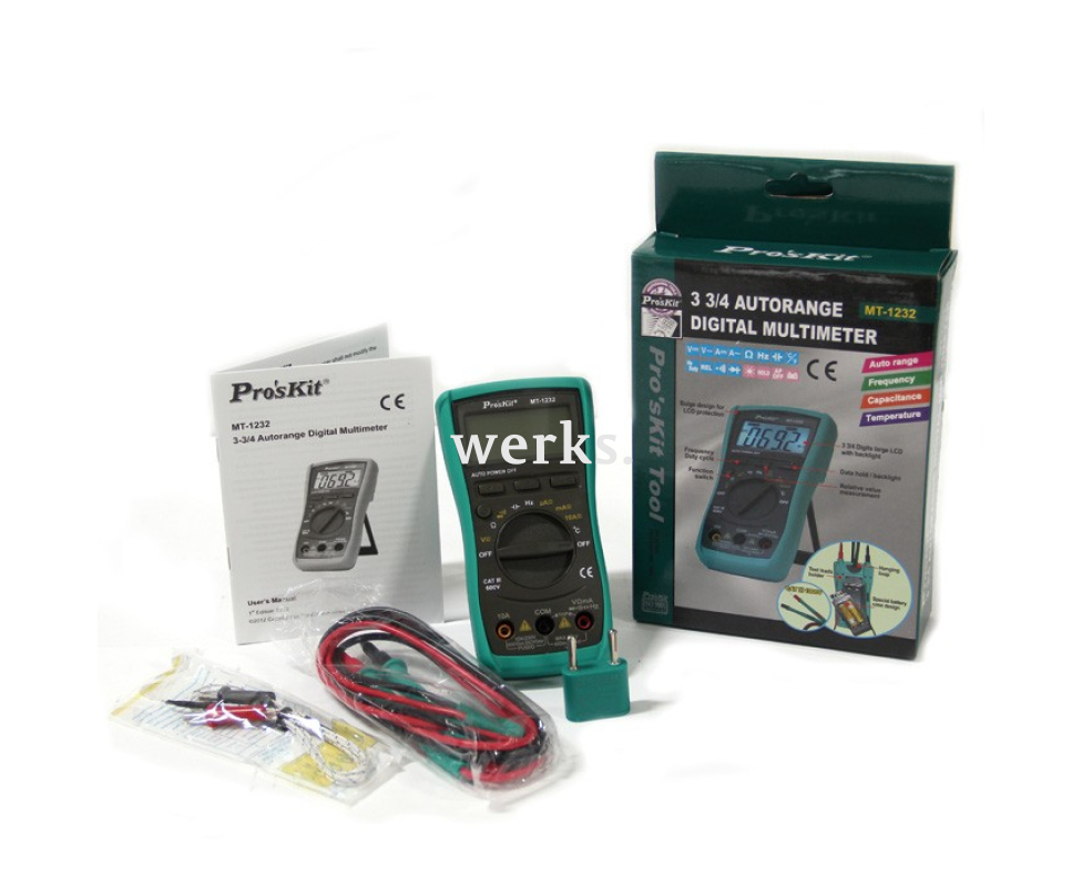 Четырехзначный ЖК-дисплей с LED-подсветкой. Проверка цепи с зуммером, функция удержания данных, автоматическое отключение, индикация выхода за пределы диапазона, сигнализация низкого заряда батареи, защита от перегрузки. Предохранитель на 250 В/10 А. Основная погрешность - не более 0,5%. Поставляется в комплекте с щупом и термозондом. Напряжение постоянного тока - 400 мВ/4 В/40 В/400 В (±0,5%), 600 В (±1,0%). Напряжение переменного тока - 4 В/40 В/400 В (±0,8%), 600 В (±1,0%). Сила постоянного тока - 40 мА/400 мА (±1,0%), 10 А (±1,2%). Сила переменного тока - 400 мкА/4000 мкА (±1,5%), 40 мА/400 мА (±1,5%), 10 А (±2,5%). Электрическое сопротивление - 4 КОм/40 КОм/400 КОм/4 МОм (±0,8%), 40 МОм (±1,2%). Частота тока - 1 Гц/10 Гц/100 Гц (±0,5%), 1 кГц/10 кГц/100 кГц (±0,5%), 1 МГц/10 МГц (±0,5%). Электроемкость - 40 нФ/400 нФ/4 мкФ/40 мкФ (±3,5%), 100 мкФ (±5,0%). Температура - от -20 °C до 1000 °C, < 400 (±1,0%), >= 400 (±1,5%). Питание - 2 батарейки АА по 1,5 В. Вес - 390 г. Прибор предназначен для измерения температуры, величины постоянного и переменного тока, напряжения, сопротивления, частоты, а также для тестирования диодов. Отлично подходит для работы с электротехническим и электронным оборудованием.