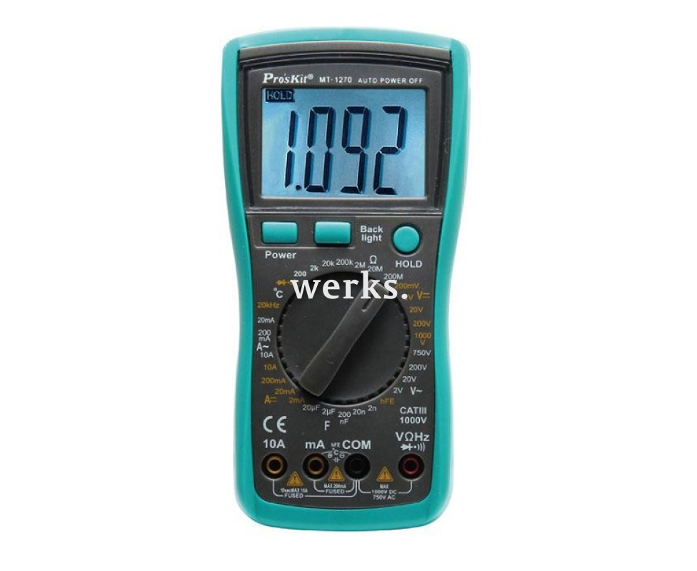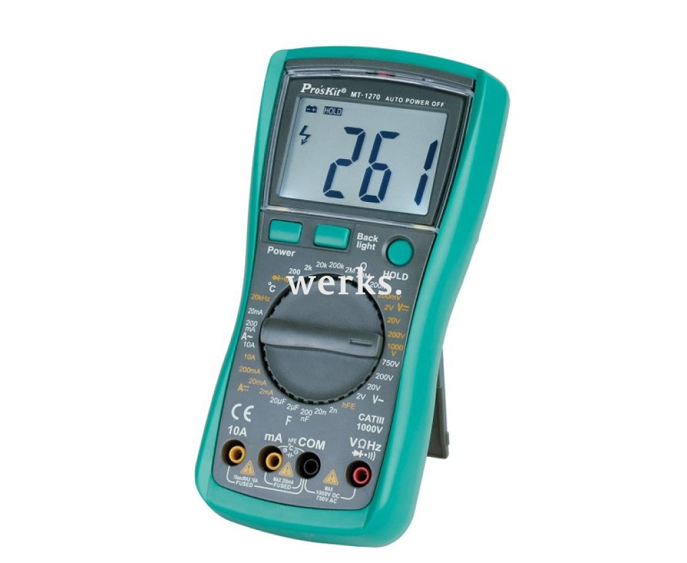 Четырехзначный ЖК-дисплей с LED-подсветкой. ЖК-панель защищена надежной крышкой. Возможность прозвонки цепи с зуммером, функция удержания данных, автоматическое отключение, индикация выхода значений за пределы диапазона, сигнализация низкого заряда батареи, защита от перегрузки. Основная погрешность составляет не более 0,5%. Поставляется в упаковке. Напряжение постоянного тока - 200 мВ/2 В/20 В/200 В (±0,5%), 1000 В (±0,8%) Напряжение переменного тока - 2 В/20 В/200 В (±0,8%), 750 В (±1,2%) Сила постоянного тока - 2 мА/20 мА (±0,8%), 200 мА (±1,2%), 10 А (±2,0%) Сила переменного тока - 2 мА (±1,0%), 200 мА (±2,0%), 10 А (±3,0%) Электрическое сопротивление - 200 Ом (±0,8%), 2 кОм/20 кОм/200 кОм/2 МОм (±0,8%), 20 МОм (±1,0%), 200 МОм (±5,0%) Частота тока - 2 кГц (±3,0%), 200 кГц (±3,0%) Электроемкость - 20 нФ/2 мкФ (±2,5%), 200 мкФ (±5,0%) Температура - -20~400°C (±1,0%), 400~1000°C (±1,5%) Питание - батарея 9 В (6F22) Вес - 536 г. Прибор предназначен для измерения постоянного и переменного тока, напряжения, сопротивления, частоты, электроемкости, температуры, а также для тестирования диодов. Отлично подходит для работы с электротехническим и электронным оборудованием.
