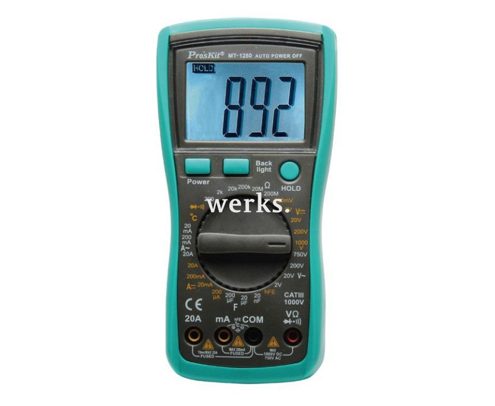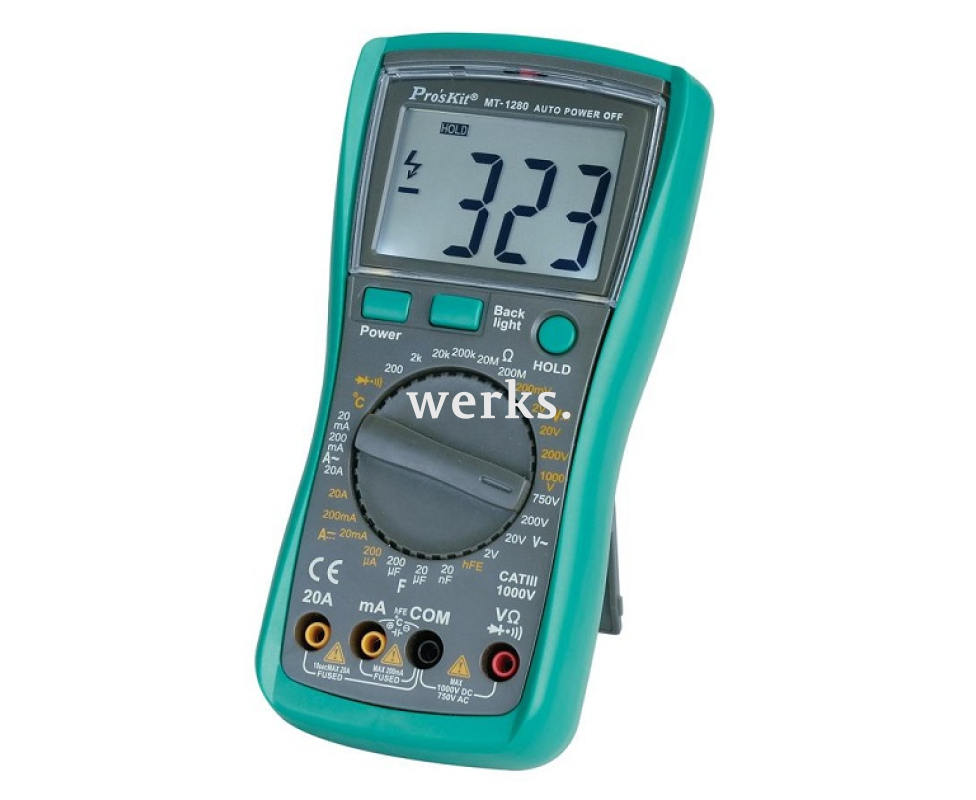Большой четырехразрядный ЖК-дисплей с LED-подсветкой. Прозвон цепей с зуммером, функция удержания данных, автоматическое отключение, светодиодный индикатор, индикация низкого заряда батареи и защита от перегрузки. Предохранитель на 250 В/10 А. Базовая погрешность составляет не более 0,5%. Поставляется в комплекте с щупом и термопарой. Напряжение постоянного тока: 200 мВ/2 В/20 В/200 В (±0,5%), 1000 В (±0,8%). Напряжение переменного тока: 2 В/20 В/200 В (±0,8%), 750 В (±1,2%). Сила постоянного тока: 200 мкА/20 мА (±0,8%), 200 мА (±1,2%), 20 А (±2,0%). Сила переменного тока: 20 мА (±1,0%), 200 мА (±2,0%), 20 А (±3,0%). Электрическое сопротивление: 200 Ом (±0,8%), 2 кОм/20 кОм/200 кОм (±0,8%), 20 МОм (±1,0%), 200 МОм (±5,0%). Электроемкость: 20 нФ (±2,5%), 20 мкФ (±2,5%), 200 мкФ (±5,0%). Температура: -20~400°C (±1,0%), 400~1000°C (±1,5%). Питание: 9 В батарея (6F22). Вес: 534 г. Прибор предназначен для измерения температуры, постоянного и переменного тока, постоянного и переменного напряжения, сопротивления, электроемкости, а также для тестирования диодов. Отлично подходит для работы с электротехническим и электронным оборудованием.
