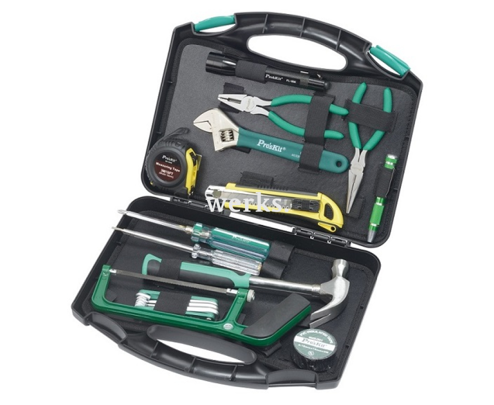 Профессиональный набор, включающий в себя самые востребованные и часто используемые инструменты для ремонта и монтажа. Упакован в прочный пластиковый кейс с двумя съемными паллетами, что делает его удобным для хранения и транспортировки. Состав набора: - 1PK-H028 Разводной ключ 8 дюймов; - 1PK-709 Длинногубцы 165 мм; - DK-2039 Универсальный нож с заменяемыми лезвиями; - 1PK-052 Пассатижи 165 мм; - SD-329H Индикатор напряжения; - DK-2040 Рулетка 3 м; - SD-5107D Двусторонняя отвертка (PH#2 / SL6.0x100 мм); - HW-221M Набор шестигранных ключей (8 шт); - SD-9814 Отвертка с набором бит (9 в 1); - 9MS-001 ПВХ изолента; - SW-106 Универсальная пила 6 дюймов; - PD-2609 Молоток с гвоздодером. Размер кейса - 320х260х60 мм. Этот набор инструментов идеально подходит для выполнения монтажных и ремонтных работ как в домашних условиях, так и в автомобиле или мастерской.