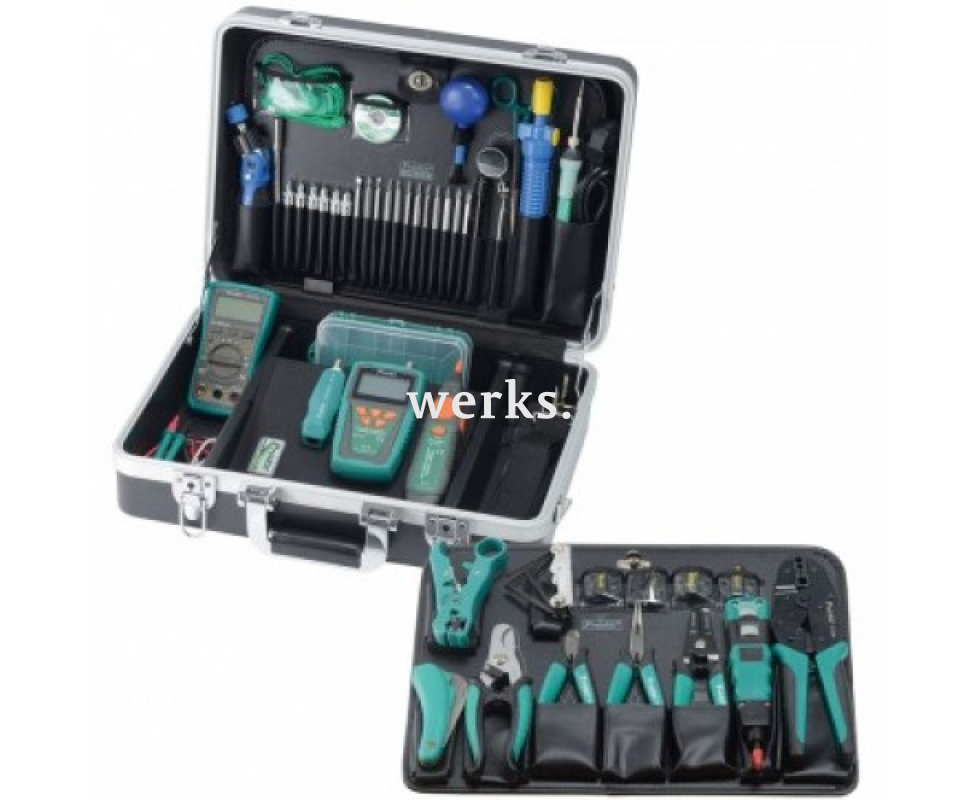 Комплексный набор инструментов отвечает высоким стандартам для установки и обслуживания компьютерных сетей. Он поставляется в прочном чемодане из ударопрочного пластика с алюминиевым каркасом. Внутри находится дополнительная паллета с инструментами. Два надежных замка и удобная ручка делают его использование комфортным. Все необходимое для инсталляции сетей собрано в одном комплекте. Состав комплекта: - MT-1232 Компактный цифровой мультиметр; - MT-7071 Тестер для сетей и линий передачи данных; - 103-132C Контейнер для хранения мелких деталей; - 8PK-611 Антистатический браслет нерегулируемый; - 8PK-031B Оплетка для удаления припоя Ø2.0 мм; - 1PK-154B Щеточка с поддувом; - 1PK-T416 Изогнутые зажим-ножницы; - 9PK-3018SD Ручка-трещотка; - 9SD055-EX Удлинитель 175 мм; - 9H165 Адаптер; - 9SK-MHM2-3.5 ¼ Разъем 3,5 мм; 9SK-MHM2-4 ¼ Разъем 4,0 мм; 9SK-MHM2-4.5 ¼ Разъем 4,5 мм; 9SK-MHM2-5 ¼ Разъем 5,0 мм; 9SK-MHM2-5.5 ¼ Разъем 5,5 мм; 9SK-MHM2-6 ¼ Разъем 6,0 мм; - 9SD055N-BIT Насадки-отвертки РН0, РН1, РН2; SL 3, 5, 6 мм; TORX T10, T15; - 9SD055-T6 Насадка-отвертка TORX T6; 9SD055-T7 Насадка-отвертка TORX T7; 9SD055-T8 Насадка-отвертка TORX T8; 9SD055-T9 Насадка-отвертка TORX T9; - 9FL-005 Минифонарик; - MS-391 Зеркало с телескопической ручкой; - DP-366P Оловоотсос 330 мм; - SI-130B-20 Керамический паяльник 12 Вт; - CP-3005F Кримпер без матрицы; - 1PK-3003D11 Матрица для коннекторов 8P8C/RJ45; - 1PK-3003D12 Сменная матрица для обжима коннекторов 6P2C/RJ11-RJ12; - 1PK-3003D17-MA Матрица для коннекторов RJ-48; - Матрица для обжима коннекторов RG-58, RG-59, RG-62, RG-6; - Матрица для обжима коннекторов RG-59, RG-6, RG-8281; - 9H002 Набор шестигранных ключей (7 шт.); - CP-3148 Инструмент для расшивки кабеля; - CP-3001D Стриппер для кабеля; - PM-727 Прецизионные кусачки для меди (130 мм); - PM-338 Прецизионные длинногубцы (160 мм); - SR-332 Усиленные универсальные ножницы; - CP-505 Компактный универсальный стриппер; - PD-998 Нож для электрики (190 мм). Размер кейса - 435x310x45 мм. Вес - 7180 г. Этот специально подобранный набор инструментов для инсталляции сетей идеально подходит для ремонтных мастерских, сервисных центров и лабораторий.