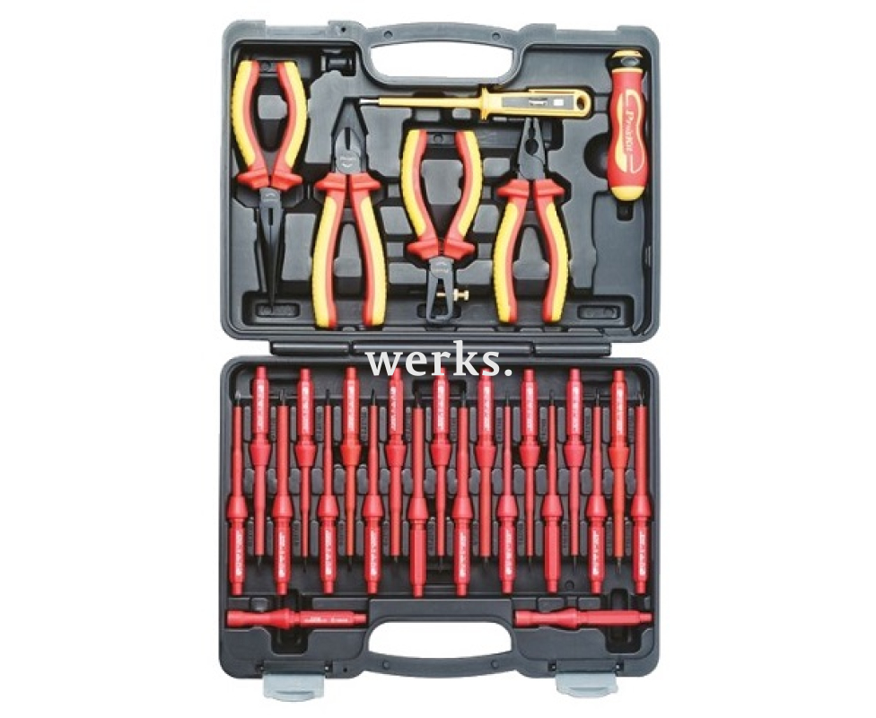 Набор включает 28 изолированных инструментов, соответствующих стандартам VDE, упакованных в прочный полиэстеровый кейс с молнией. В комплект входят плоскогубцы, отвертки различных типов и пробник напряжения. Все инструменты размещены в специальных отсеках. Продукция сертифицирована по европейским нормам и прошла проверку на безопасность при работе с оборудованием под напряжением до 1000 В переменного тока. Товар доступен только из наличия на складе, предзаказ не осуществляется. Состав набора: - 1PK-H024 Разводной ключ 4' - 203-132E Контейнер для компонентов - 8PK-025 Набор шестигранных ключей со сферической головкой (7 шт.): 2.5, 3, 4, 5, 6, 8, 10 мм - 8PK-366NA Оловоотсос - 908-T301 Набор пинцетов (2 шт.) - DK-2039 Нож с 3 сменными лезвиями - DK-2047N Ножницы для электрики (145 мм) - MT-1232 Цифровой мультиметр - PM-910 Изолированный стриппер (160 мм) - PM-911 Изолированные пассатижи (195 мм) - PM-917 Изолированные бокорезы (165 мм) - PM-918 Изолированные длинногубцы (200 мм) - SD-328H Индикатор напряжения - SD-800-P1 Крестовая отвертка #1 (80 мм) - SD-800-P2 Крестовая отвертка #2 (100 мм) - SD-800-S3.0 Шлицевая отвертка (3.0x100 мм) - SD-800-S5.5 Шлицевая отвертка (5.5x125 мм) - SH-1025 Очиститель жал - SI-130B-20 Паяльник с керамическим нагревателем Размеры сумки: 360x270x85 мм. Вес: 1500 г. Идеально подходит для электриков, авторемонтников, специалистов в области авиастроения и многих других профессий, связанных с работой на оборудовании под напряжением.
