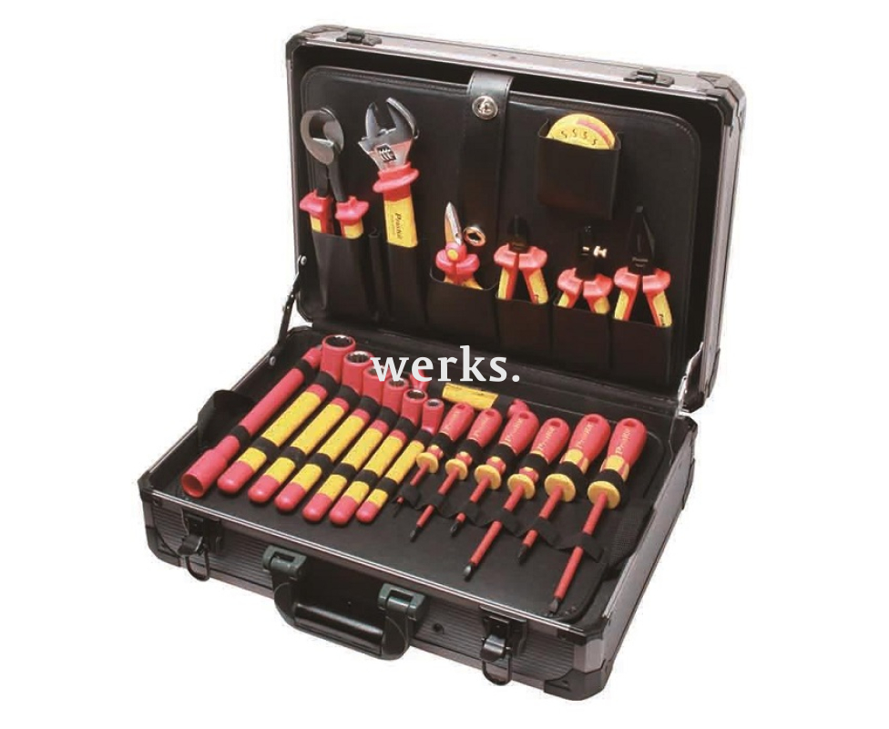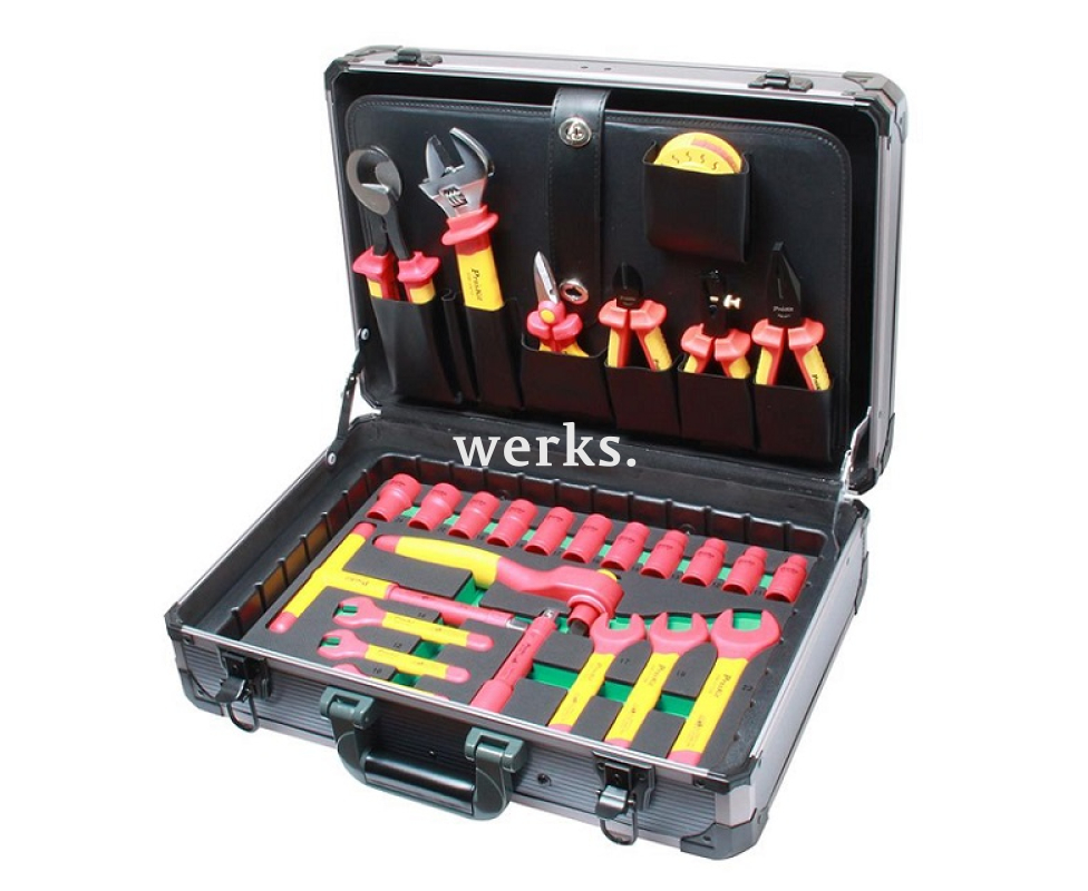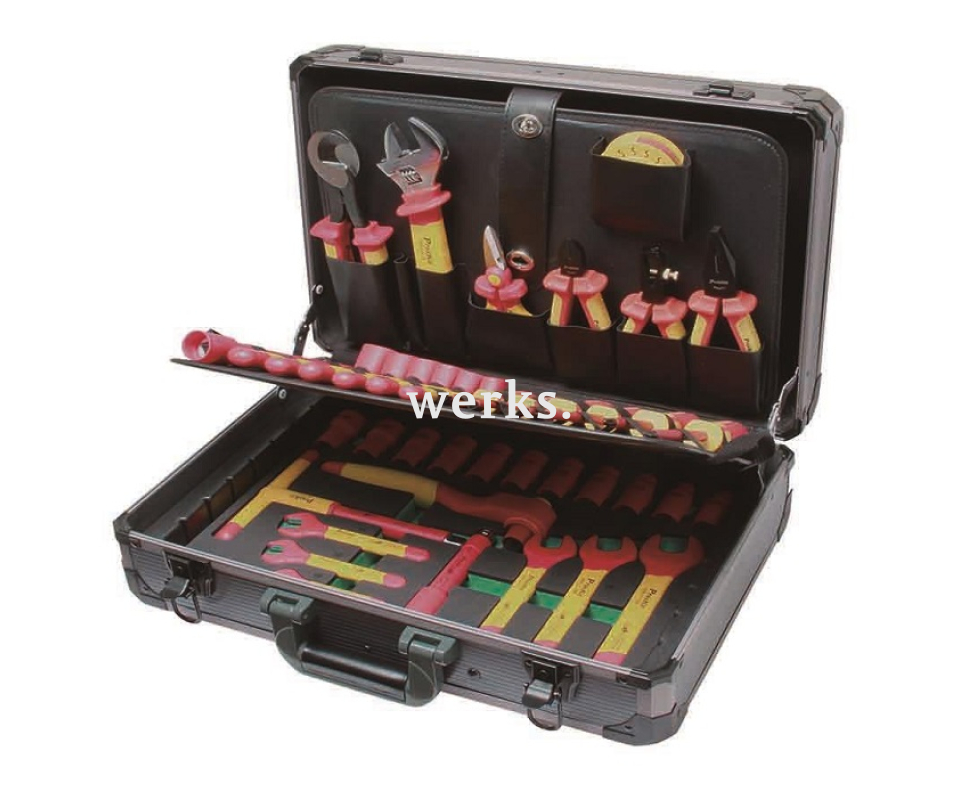 Набор включает 41 изолированный инструмент, соответствующий стандартам VDE, упакованный в прочный пластиковый кейс с алюминиевым каркасом. Все инструменты размещены в специальных отсеках и проверены на безопасность при работе с оборудованием, находящимся под напряжением до 1000 В переменного тока. Состав набора: - PM-911 Пассатижи с изолированными ручками (195 мм). - PM-910 Изолированный стриппер (160 мм). - SR-V210 Изолированный кабельный резак (250 мм). - PM-917 Бокорезы с изолированными ручками (165 мм). - SR-V336 Изолированные ножницы (160 мм). - MS-V001 Изолента. - HW-V110B Гаечный ключ с изолированной ручкой (10 мм). - HW-V113B Гаечный ключ с изолированной ручкой (13 мм). - HW-V114B Гаечный ключ с изолированной ручкой (14 мм). - HW-V117B Гаечный ключ с изолированной ручкой (17 мм). - HW-V119B Гаечный ключ с изолированной ручкой (19 мм). - HW-V122B Гаечный ключ с изолированной ручкой (22 мм). - HW-V210B Изолированный накидной ключ (10 мм). - HW-V213B Изолированный накидной ключ (13 мм). - HW-V214B Изолированный накидной ключ (14 мм). - HW-V217B Изолированный накидной ключ (17 мм). - HW-V219B Изолированный накидной ключ (19 мм). - HW-V222B Изолированный накидной ключ (22 мм). - SD-800-S2.5 Отвертка с изолированной ручкой (-2.5x75). - SD-800-S4.0 Отвертка с изолированной ручкой (-4.0x100). - SD-800-S5.5 Отвертка с изолированной ручкой (-5.5x125). - SD-800-S6.5 Отвертка с изолированной ручкой (-6.5×150). - SD-800-P1 Отвертка с изолированной ручкой (#1x80). - SD-800-P2 Отвертка с изолированной ручкой (#2x100). - SK-V752 Отвертка с изолированной T-образной ручкой (200 мм). - SK-V710 Изолированная трещотка 1/2' (200 мм). - SK-V851 Изолированный удлинитель 1/2' (125 мм). - SK-V852 Изолированный удлинитель 1/2' (250 мм). - SK-V410B Изолированная 1/2' торцевая головка (10 мм). - SK-V411B Изолированная 1/2' торцевая головка (11 мм). - SK-V412B Изолированная 1/2' торцевая головка (12 мм). - SK-V413B Изолированная 1/2' торцевая головка (13 мм). - SK-V414B Изолированная 1/2' торцевая головка (14 мм). - SK-V416B Изолированная 1/2' торцевая головка (16 мм). - SK-V417B Изолированная 1/2' торцевая головка (17 мм). - SK-V418B Изолированная 1/2' торцевая головка (18 мм). - SK-V419B Изолированная 1/2' торцевая головка (19 мм). - SK-V422B Изолированная 1/2' торцевая головка (22 мм). - SK-V424B Изолированная 1/2' торцевая головка (24 мм). - PD-V003A Кабельный нож с прямым лезвием и изолированной ручкой (50x180 мм). - HW-V610 Изолированный разводной ключ (10'). Размер кейса - 486х325х159 мм. Этот набор идеально подходит для электриков, авторемонтников, специалистов в области авиастроения и многих других профессий, связанных с работой на оборудовании под напряжением.