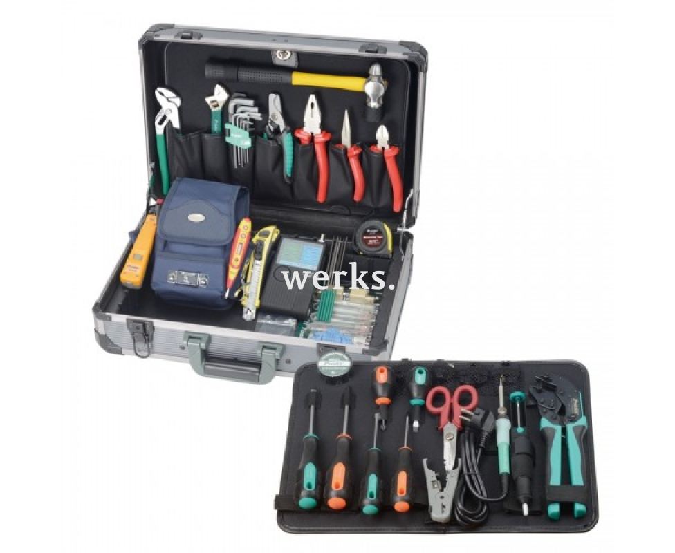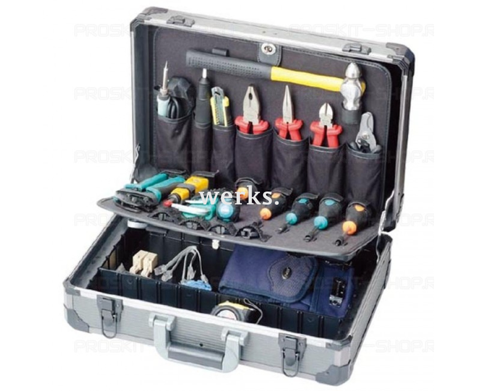 Профессиональный набор инструментов для монтажа сетей. Комплект поставляется в алюминиевом кейсе с усиленными угловыми каркасами, замками и двумя внутренними паллетами. Инструменты надежно закреплены внутри кейса. Состав набора: - 8PK-605A Набор надфилей (5 шт.) - CP-371 Кримпер без матрицы - 9CP-236D6P Матрица для обжима RJ11 - 9CP-236D8P Матрица для обжима RJ45 - CP-3140 Нож-укладчик для кабеля - 5CP-3140-66 Запасное лезвие для CP-3140 - 9CP-336DH1 Матрица для обжима RG 59,6 F-образных - 9CP-336DP1 Матрица для обжима RG 58,59,62,6 - DK-2039 Универсальный нож - DK-2047N Ножницы универсальные - DP-366D Оловоотсос - 9FL-506 Фонарик - 1PK-H026 Разводной ключ 6' - 9MS-001 ПВХ изолента - NT-305 Отвертка-индикатор напряжения - 1PK-051AS Комбинированные плоскогубцы 200 мм - 1PK-067AS Профессиональные бокорезы 160 мм - 1PK-709AS Длинногубцы-бокорезы 165 мм - SI-130B-20 Паяльник с керамическим жалом 220 В - PN-P008 Переставные трубные клещи 204 мм - 9SD-202A Шлицевая отвертка 5.0x75 мм - 9SD-202B Крестовая отвертка Phillips РН1x75 мм - 9SD-207A Шлицевая отвертка 6.0x100 мм - 9SD-207B Крестовая отвертка Phillips РН2x100 мм - 9SD-220A Короткая шлицевая отвертка 6.0x40 мм - 9SD-220B Короткая крестовая отвертка Phillips РН2x40 мм - 9CP-501BN Инструмент для снятия изоляции - HW-129B Набор удлиненных ключей НЕХ (9 шт.: 1.5, 2, 2.5, 3, 4, 5, 6, 8, 10 мм) - MT-7057 Тестер витой пары и коаксиального кабеля - MT-8091 Тестер-модулятор 3 в 1 на 4P/6P/8P - PD-2607 Молоток с прорезиненной ручкой - SR-332 Ножницы универсальные - ST-2012H Поясная сумка для инструмента - DK-2040 Рулетка 3 м Размеры кейса - 438х325х159 мм. Вес - 10175 г. Все инструменты тщательно подобраны для работы с телекоммуникациями, CCTV и CATV. Это полный профессиональный комплект для установки любой сети.