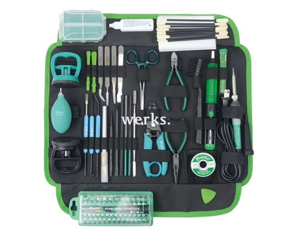 Профессиональный набор, состоящий из 30 электронных и паяльных инструментов, а также отвертки с 55 специализированными битами, включая Pentalobe и TORX PLUS. Упакован в прочную сумку-скатку, которая помещена в кейс с наплечным ремнем. Состав набора: - SD-9828 Отвертка с 55 битами; - SI-130B-20 Паяльник с керамическим нагревателем; - 9SN-310G Бессвинцовый припой; - 8PK-031B Поглотитель припоя; - DP-366J Оловоотсос; - PM-906B Длинные плоскогубцы; - PM-905B Плоскогубцы для диагональной резки; - 8PK-3001D Клещи для зачистки кабеля; - 1PK-T406 Пинцет-ножницы; - 9PK-9110A Подъемная лопатка; - 9PK-9110B, 9PK-9110C Рычажки из полиоксиметилена; - 9H084 Вспомогательный инструмент-игла; - 9H085 Вспомогательный инструмент-спаджер; - 9H086 Вспомогательный инструмент-вилка; - 9MS-9326 Двусторонний металлический спаджер; - 9MS-9327 Металлический спаджер; - MS-161 Присоска для поднятия дисплея; - 9K003A-1 Плоский надфиль; - 9K003B-1 Круглый надфиль; - 9S002C Вспомогательный инструмент для пайки; - 8PK-394B Скальпель; - 1PK-102T Узкий пинцет; - 1PK-104T Изогнутый пинцет; - 1PK-125T Прямой пинцет; - AS-501A Щетка для очистки; - MS-153A Груша для обдува; - 8PK-C002 Набор для чистки оптоволокна; - 9SB-1007G Кассетница для компонентов. Вес - 2646 г. Отлично подходит для разборки и ремонта устройств Apple, смартфонов, планшетов, ноутбуков, фотоаппаратов и игровых консолей.