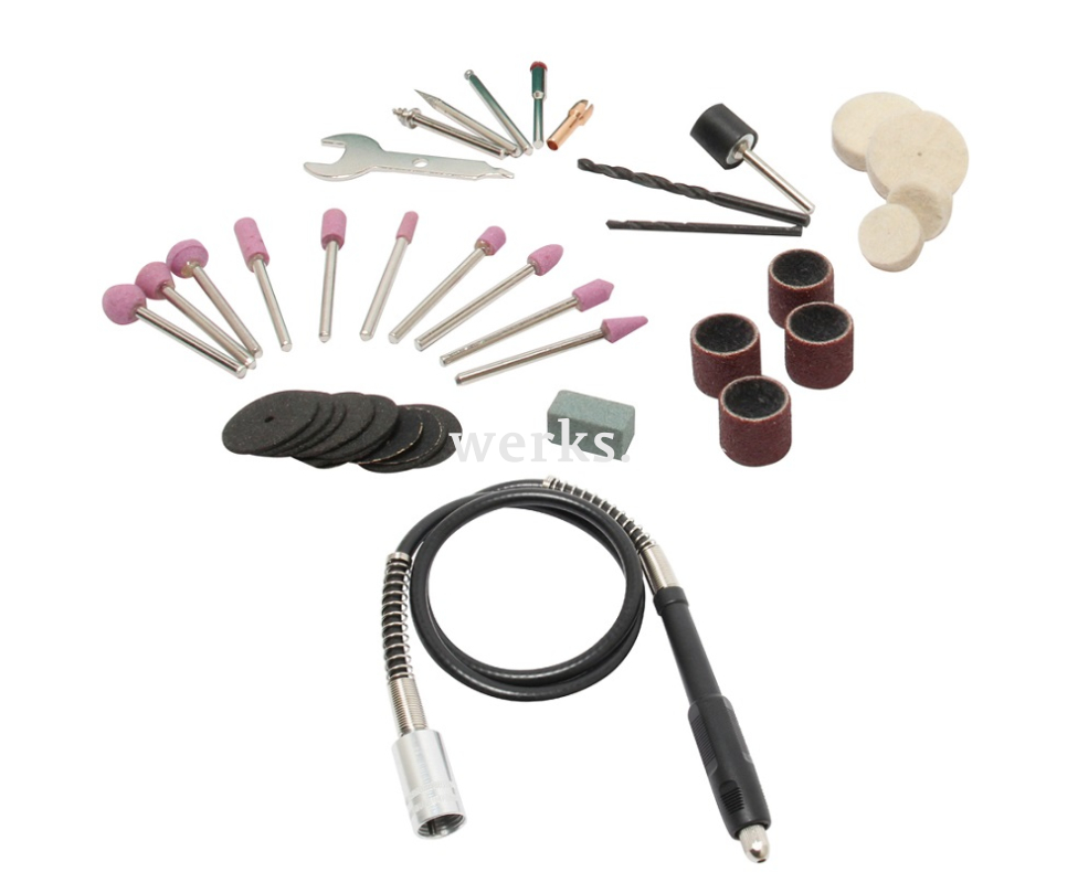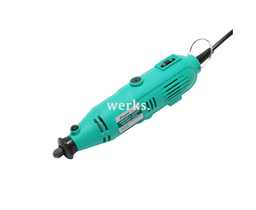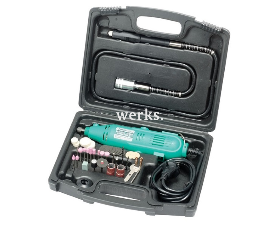 Многофункциональный универсальный инструмент. Эргономичный дизайн, гибкий электрошнур и несколько режимов скорости. В комплекте 40 различных насадок. Мощный прибор, предназначенный для шлифовальных и фрезеровочных работ, а также других аналогичных задач. Нескользящий корпус с кнопкой блокировки патрона. Цанговый патрон с максимальным диаметром 3,2 мм и легкой заменой насадок. Поставляется в прочном пластиковом кейсе. Стандартная вилка - тип I. Питание - 100~240 В AC 50/60 Гц / 135 Вт. Скорость вращения без нагрузки - 10000-32000 об/мин. Вес - 1428 г. Используется для точного сверления, полировки, гравировки, трассировки, обточки, удаления заусенцев, шлифования и фрезерования.