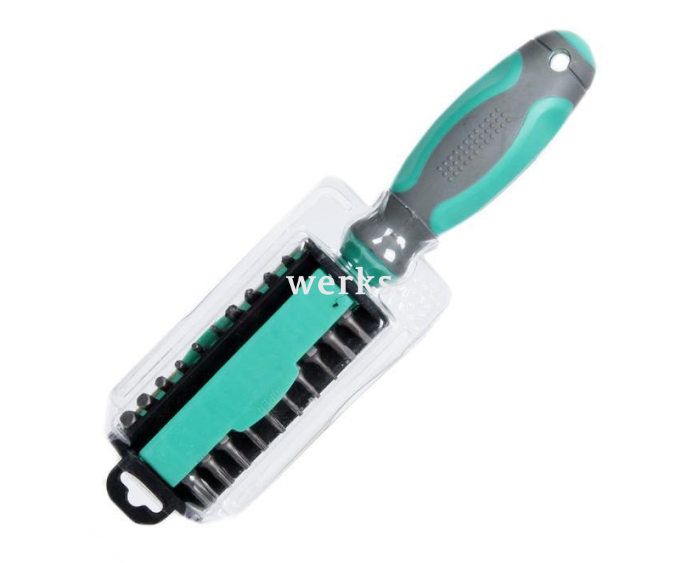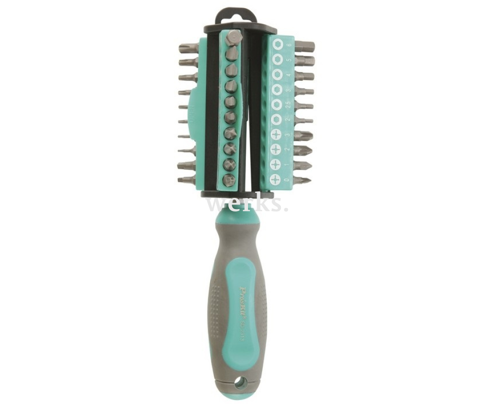 В комплект ProsKit 8PK-203 входят магнитная отвертка, магнитный держатель бит и 30 сменных бит из хромванадиевой стали SAE6150. Удобная, мягкая и эргономичная рукоятка-держатель предотвращает скольжение и оснащена защитой от перекатывания. Биты хранятся в практичном треугольном футляре. Поставка осуществляется в двойном блистере. Типы шлицев: - SL (3.5, 4.5, 5.5, 6, 8), - PH (PH0, PH1, PH2, PH3), - PZ (PZ0, PZ1, PZ2, PZ3), - TORX (T5, T6, T7, T8, T10, T15, T20, T35), - Robertson (S1, S2), - HEX (2, 2.5, 3, 4, 5, 6, 8). Вес - 320 г. Это качественный набор, подходящий для общих ремонтных, слесарных, монтажных и автомеханических работ, а также для обработки дерева и металла. Компактные размеры бит позволяют использовать набор для прецизионных задач в электронике и точной механике.