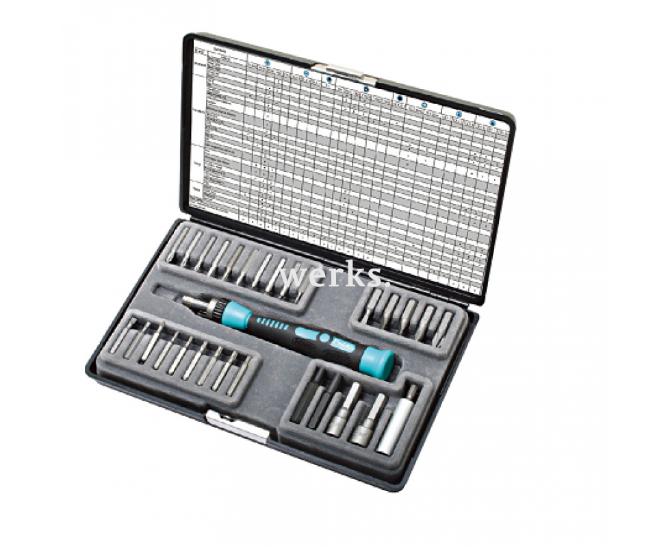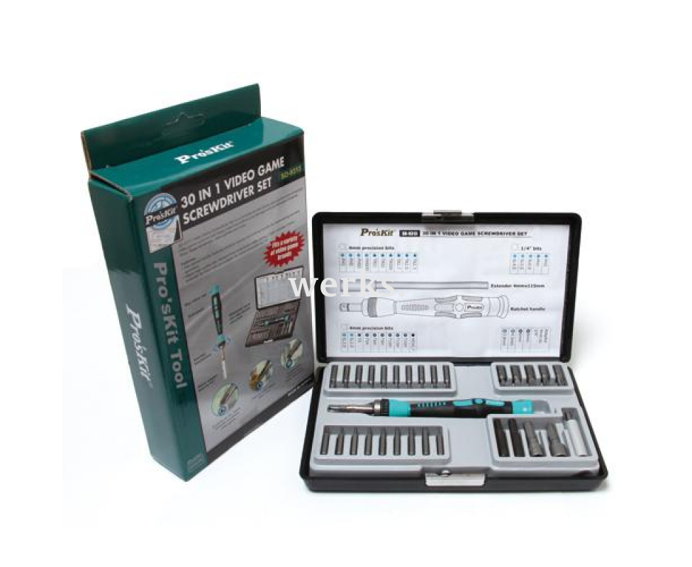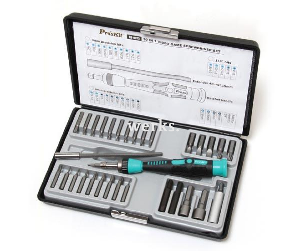 В комплект ProsKit SD-9313 входит отвертка-держатель с храповым механизмом, четыре переходника с диаметром 4,0 мм на 1/4 дюйма, удлинитель диаметром 4,0 мм и длиной 115 мм, а также 28 сменных бит, выполненных из хромванадиевой стали, для различных типов шлицев и длины. Эргономичная рукоятка-держатель обеспечивает надежный захват. Диаметр бит составляет 4,0 мм, 1/4 дюйма. Типы шлицев: - SL (2.0, 3.0, 4.0, 5.0, 6.0), - PH (PH 000, PH 00, PH 0, PH 1, PH 2), - TORX (T3.8, T4, T4.5), - TORX BO (T5H, T6H, T8H, T10H, T15H, T20H), - HEX (0.7, 6.0, 8.0), - TRI-Wing (TRI00, TRI0, TRI1), - TA (TA1.7, TA2.0, TA2.3). Вес составляет 430 г. Этот набор предназначен для ремонта смартфонов, планшетов, ноутбуков, карманных компьютеров, камер, корпусов электронных устройств и игровых систем от таких популярных брендов, как Apple, HTC, Samsung, Sony, Microsoft, Nintendo, Sega и других, без риска повреждения.