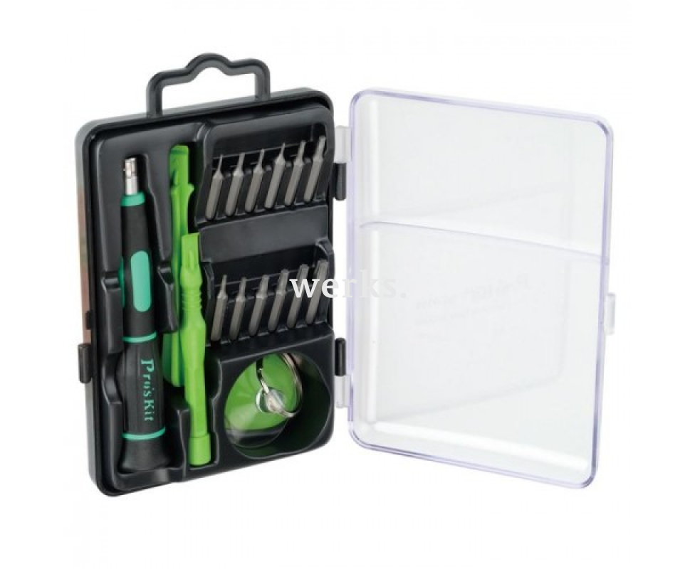 Набор ProsKit, состоящий из 17 инструментов для ремонта устройств Apple, поставляется в удобной пластиковой упаковке для хранения и транспортировки. Состав набора: - держатель для бит - бита PL (TS1 x 40 мм) - бита PH (PH000 x 40 мм) - шлицевая бита 1,5 мм - набор бит TORX (T4, T6, T8, T10, T15, T20) - набор бит HEX (2.0, 1.5 мм) - рычажки для открытия (84,4 и 88,7 мм) - присоска для экрана диаметром 36 мм - подъемная пластина (медиатор) размером 30,5х30,5х30,5 мм. Вес набора составляет 97 г. Этот набор идеально подходит для точных ремонтных работ с iPhone и другими устройствами Apple.