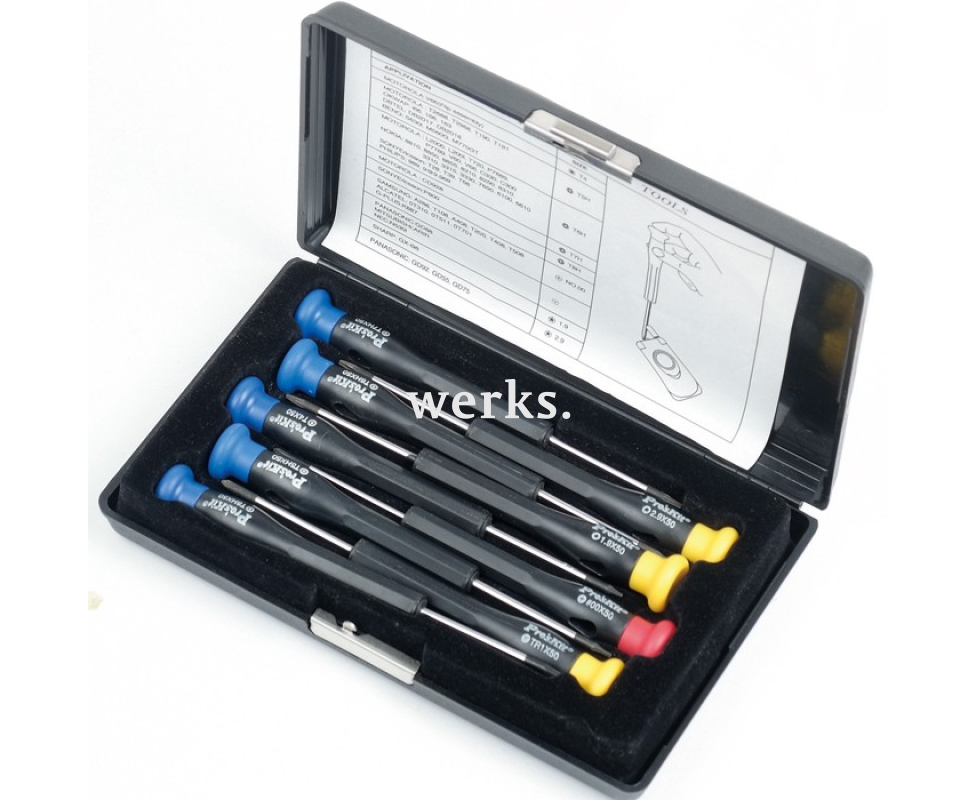 Набор включает 9 прецизионных отверток для различных типов шлицев: крестовые шлицы Phillips, TORX, TORX BO (с защитным штырьком) и Pentalobe. Упакован в удобный и практичный переносной кейс. Длина отверток составляет 50 мм. Типы шлицев: - PH (PH00x50), - TORX (T4x50), - TORX BO (T5H, T6H, T7H, T8H x 50), - PL (P1.9, P2.0, x 50). Вес - 353 г. Используется для разборки и ремонта мобильных телефонов.