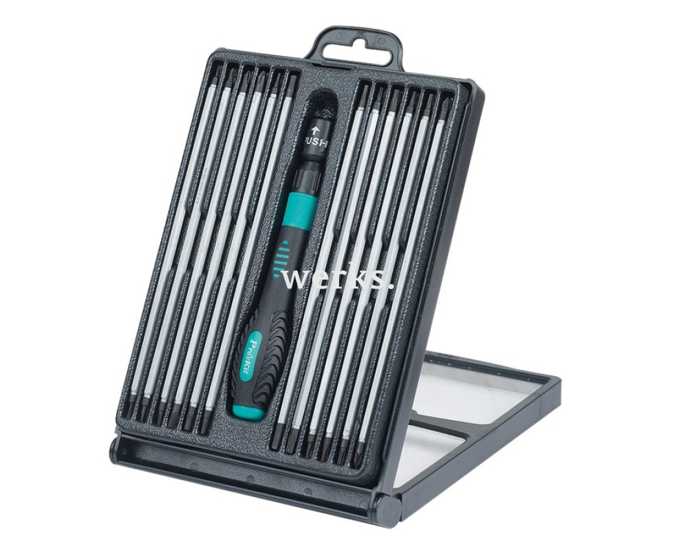 В комплект Pro'sKit SD-9824 входит реверсивная отвертка-держатель с храповым механизмом и 12 прецизионными двусторонними сменными битами, выполненными из хромванадиевой стали, подходящими для различных типов шлицев. Удобная и нескользящая эргономичная рукоятка обеспечивает комфорт в работе. Диаметр бит составляет 4,0 мм. Типы шлицев: - SL (1.5, 2.0, 3.0, 4.0), - PH (PH 000, PH 00, PH 0, PH 1), - PZ (PZ0, PZ1), - TORX BO (T5H, T6H, T7H, T8H, T9H, T10H, T15H, T20H), - HEX (1.5, 2.0, 2.5, 3.0, 3.5, 4.0). Вес набора составляет 429 г. Этот набор идеально подходит для точных работ с электроникой и деликатной механикой.