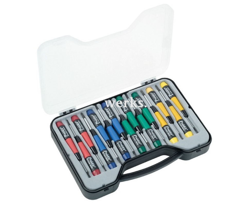 Набор ProsKit включает 15 прецизионных отверток с разнообразными типами шлицев. Жала выполнены из прочной хромированной стали высокого качества. Рабочие концы дополнительно обработаны пескоструйным методом и покрыты оксидной пленкой. Тонкие нескользящие рукоятки обеспечивают комфорт в работе. Каждая цветная рукоятка соответствует определенному типу шлица. Набор поставляется в компактной пластиковой упаковке. Состав набора: - отвертки SL (1.0x40, 2.0x40, 3.0x40, 3.5x40), - отвертки PH (PH000x40, PH00x40, PH0x40), - отвертки TORX (T6x40, T8x40, T10x40, T15x40), - отвертки HEX (1.5x40, 2.0x40, 2.5x40, 3.0x40). Вес - 543 г. Этот набор идеально подходит для точных ремонтных работ с электронными компонентами и деликатной механикой.