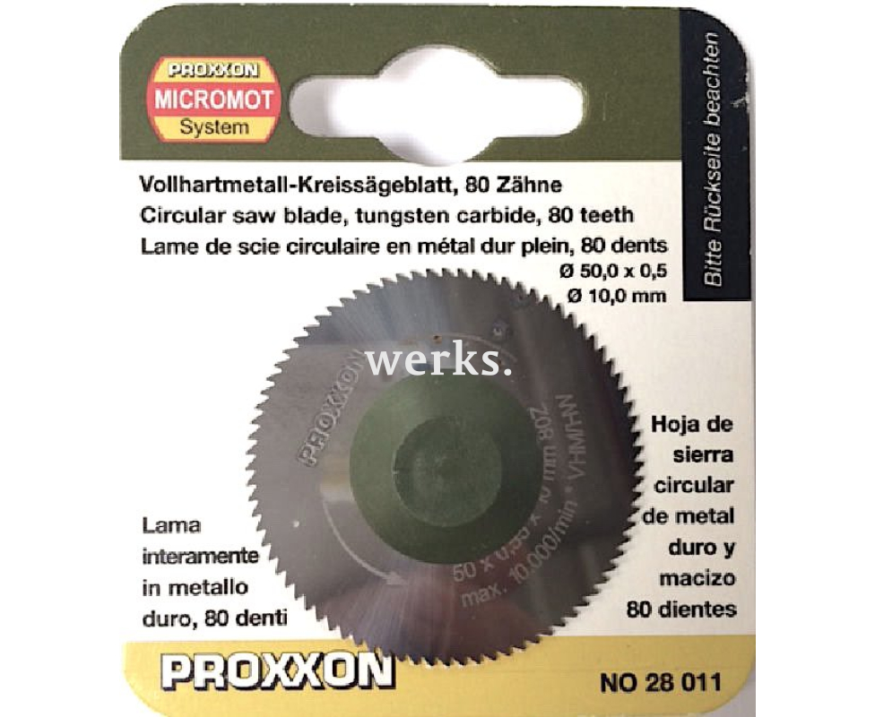 Изготовлен из высоколегированной стали. Диаметр посадочного отверстия составляет 10 мм, а толщина диска равна 0,5 мм. Оснащен 80 мелкими зубьями, обладающими высокой режущей способностью. Предназначен для быстрой и точной резки листов стеклопластика толщиной до 3 мм, цветных металлов, дюропласта и других материалов. Максимальная скорость достигает 10 000 об./мин, а оптимальная рабочая скорость составляет 4 000 об./мин. Идеально подходит для использования с настольной циркулярной пилой Proxxon KS 230.