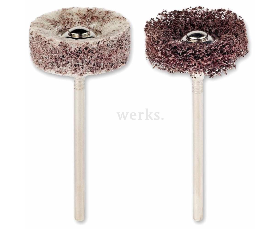 Изготовлены из прочного нейлонового волокна. Размеры: длина - 44 мм, ширина - 3 мм, хвостовик диаметром 2.35 мм. Эти инструменты предназначены для очистки, матирования и шлифовки стали, нержавеющей стали, цветных металлов, золота, серебра и титана. Максимальная скорость вращения составляет 40 000 об./мин, а оптимальная рабочая скорость - от 15 000 до 18 000 об./мин.