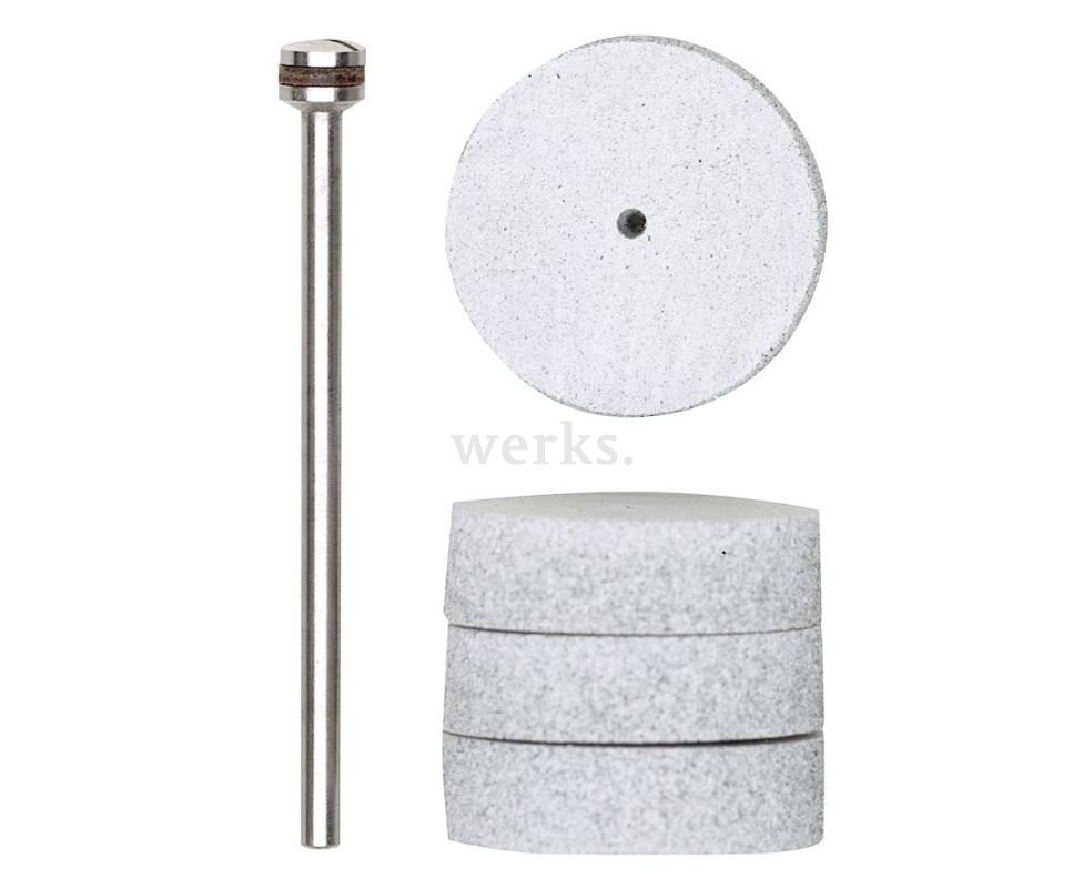 Круглые диски созданы из карбида кремния. Их толщина составляет 6 мм, а диаметр внутреннего отверстия - 1,8 мм. Эти диски предназначены для шлифовки и полировки поверхностей режущих кромок из оргстекла, акрила и плексигласа. Максимальная скорость вращения достигает 5 000 об./мин. Дискодержатель имеет длину 44 мм и хвостовик диаметром 2,35 мм.
