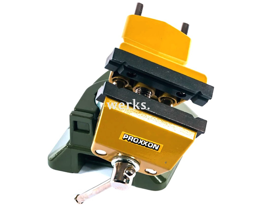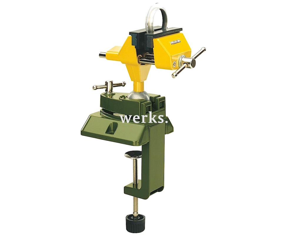 Удобные и надежные прецизионные тиски обеспечивают быструю и надежную фиксацию деталей на рабочем столе. Держатель выполнен из литого под давлением цинка. Благодаря шарнирному механизму, тиски могут вращаться и фиксироваться в любом направлении. Губки шириной 75 мм имеют вертикальные и горизонтальные V-образные вырезы для захвата круглых объектов, а также съемные резиновые защитные накладки для удержания хрупких деталей. Максимальное расстояние между губками составляет 70 мм. К рабочей поверхности они крепятся с помощью струбцины или двух винтов.