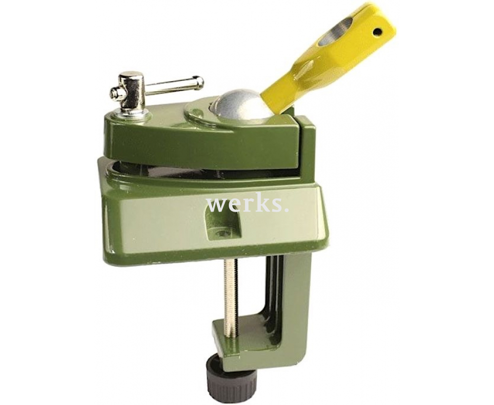 Держатель выполнен из алюминия, полученного методом литья под давлением. Он оснащен шаровой опорой, что позволяет вращать и фиксировать его в различных направлениях. Идеально подходит для быстрой и надежной установки любого электроинструмента Proxxon с диаметром шейки 20 мм. К рабочей поверхности (максимальная толщина 60 мм) он крепится с помощью струбцины или двух винтов.