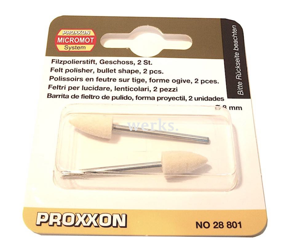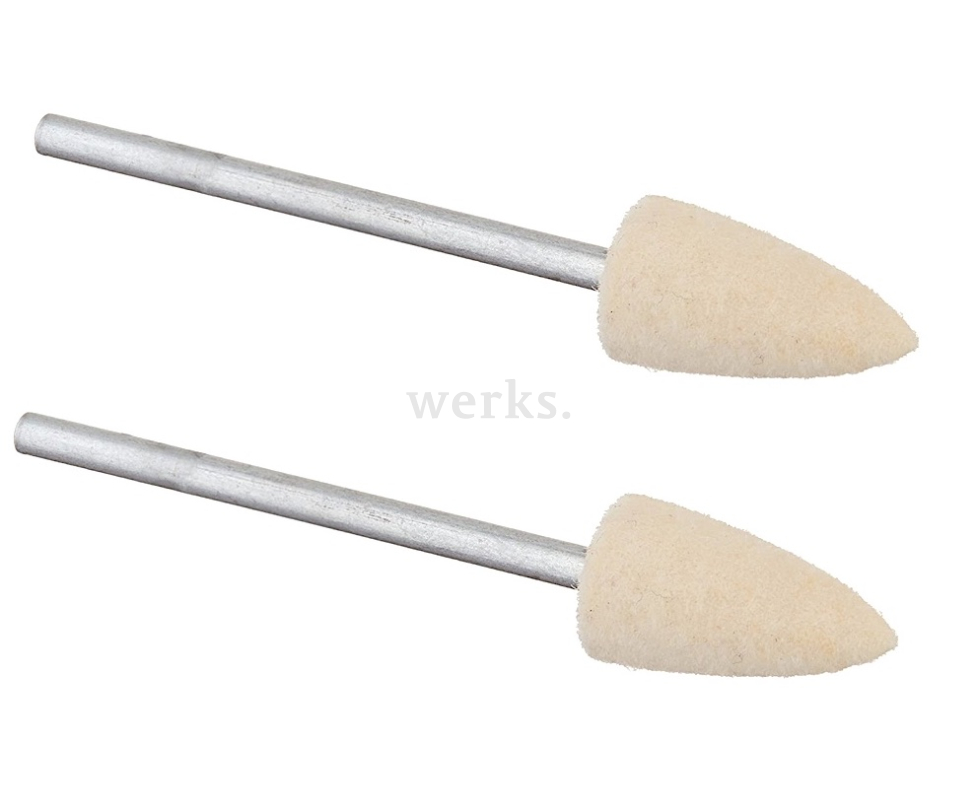 Две насадки в форме пули, изготовленные из качественного войлока. Длина составляет 44 мм, длина рабочей части - 15 мм, хвостовик имеет диаметр 2.35 мм. Эти насадки предназначены для полировки таких материалов, как золото, платина, серебро, латунь, алюминий, керамика и фарфор с применением полировальной пасты, а также для восстановления лакированных поверхностей из дерева и пластика. Максимальная скорость вращения достигает 15 000 об./мин, а оптимальная рабочая скорость составляет 10 000 - 12 000 об./мин.