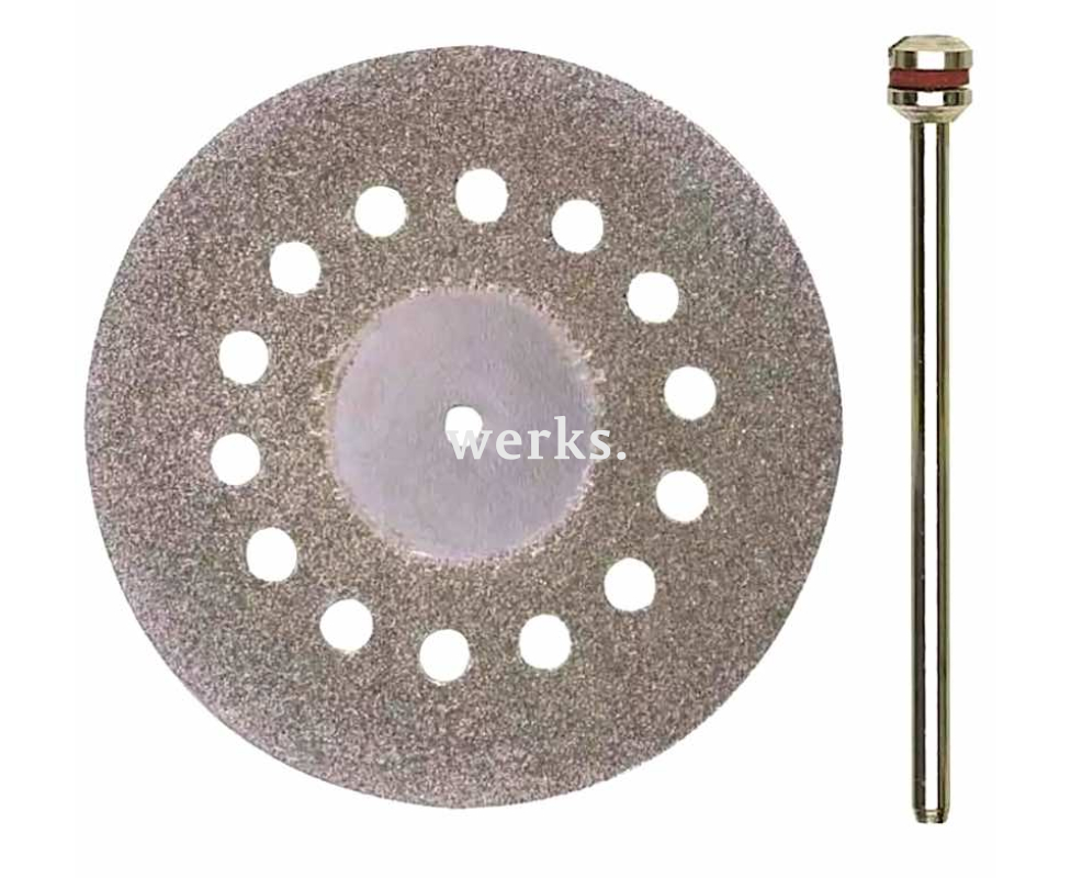 Изготовлен из инструментальной стали с алмазным покрытием. Вентиляционные отверстия способствуют длительной эксплуатации без перегрева. Толщина диска составляет 0.6 мм. Дискодержатель имеет длину 44 мм и хвостовик диаметром 2.35 мм. Предназначен для резки твердых и хрупких материалов, таких как сталь (включая хром-кобальтовый сплав), стекло, керамика, фарфор и пластмассы, а также для шлифовки и удаления заусенцев.