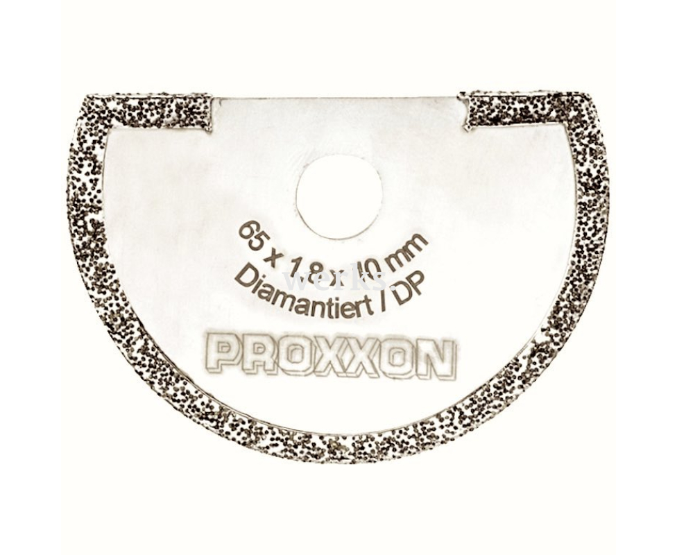 Изготовлен из инструментальной стали с алмазным покрытием. Толщина составляет 1.8 мм, диаметр посадочного отверстия равен 10 мм. Предназначен для резки мрамора, кирпича и сухой штукатурки. Совместим с угловой шлифовальной машиной Proxxon OZI/Е. Упакован в блистер.