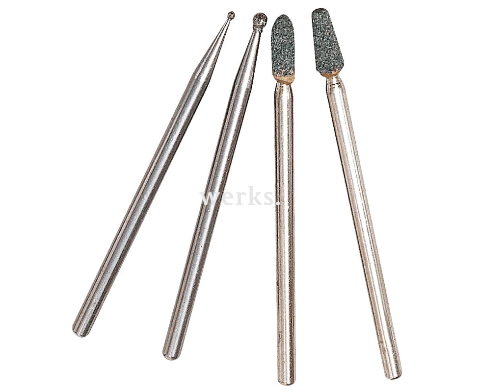 Комплект насадок предназначен для гравировки, шлифовки и матирования стеклянных поверхностей. В набор входят алмазный шаровидный бор с диаметром рабочей части 1 мм, алмазный шаровидный бор с рабочей частью 1,8 мм, конусовидный бор из карбида кремния с размерами 3/2 х 5 мм и пулевидный бор из карбида кремния с рабочей частью 2/2,5 х 7 мм. Диаметр хвостовика составляет 2,35 мм, а длина боров — 44 мм. Упаковка — блистерная.