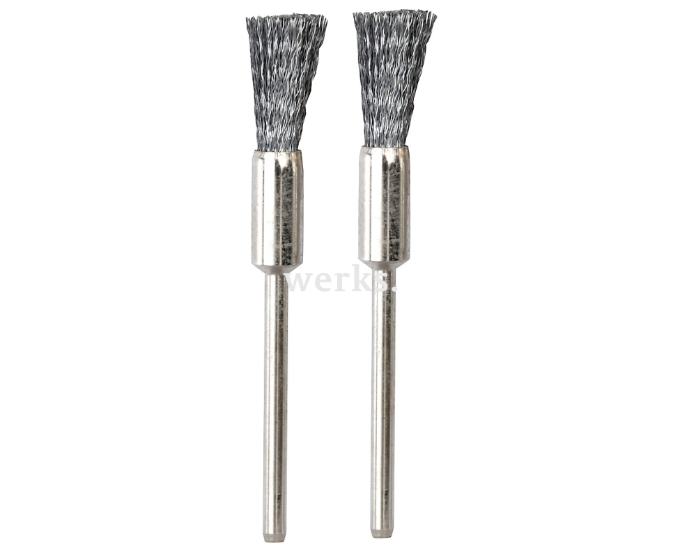 Две кистевые щетки из прочной стальной проволоки. Длина составляет 50 мм, диаметр хвостовика - 2.35 мм. Эти щетки предназначены для шлифовки, матирования, очистки, скругления краев и тонкой обработки различных материалов, таких как металл, дерево, чугун, пластик и камень. Рекомендуется применять с легким нажимом и в соответствии с указанной скоростью вращения.