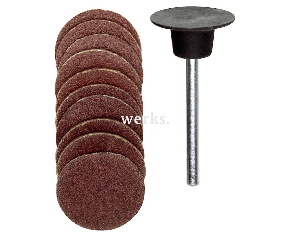Круглые диски созданы из тонкого корундового абразива (зернистость К120 - 5 шт., зернистость К150 - 5 шт.) на текстильной основе. Они предназначены для шлифовки и полировки чугуна, нержавеющей стали, цветных металлов, пластика и древесины, а также для снятия фасок и заусенцев. Для обработки стали требуется высокая скорость вращения, для дерева - средняя, а для пластика - низкая. В комплект входит дискодержатель диаметром 3 мм.