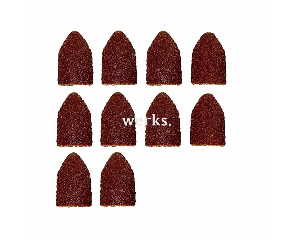 Десять конусов из корундового абразива с зернистостью К80 (5 штук) и К150 (5 штук). Длина рабочей части составляет 13 мм. Эти конусы предназначены для шлифовки, выравнивания и полировки стали, нержавеющей стали, цветных металлов, чугуна, пластиков и древесины, а также для снятия фасок, обработки канавок и внутренних радиусов.
