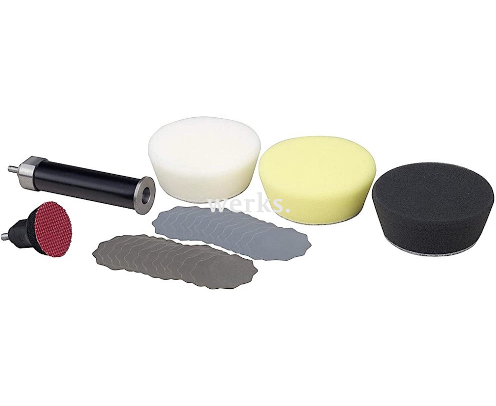 Универсальный комплект сменных насадок для тонкой шлифовки и полировки. В набор входят: удлинитель длиной 80 мм, опорный диск, 12 шлифовальных дисков с волнистым краем и зернистостью К1000, 12 шлифовальных дисков с волнистым краем и зернистостью К2500, а также конические полировальные губки (жесткая, средняя и мягкая) - по одной штуке каждой. Диаметр опорного диска для быстрого крепления на липучке составляет 30 мм. Комплект идеально подходит для выполнения ремонтных работ в труднодоступных местах, таких как мотоциклы, колесные обода, внутренние пространства автомобилей и моторные отсеки. Совместим с угловыми полировальными машинами WP/E и WP/A. Упакован в блистер.