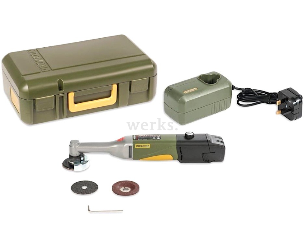 Удлиненная головка выполнена из алюминия, литого под давлением, а корпус изготовлен из полиамида, армированного стекловолокном. Оснащена электронным регулятором скорости. Уникальная запатентованная конструкция мотора позволяет создать компактное, но мощное устройство. В комплект входят литий-ионный аккумулятор Li/A (10.8 В, 2.6Ah), зарядное устройство LG/A, корундовый шлифовальный диск (К80), ламельный шлифовальный диск (К100) и усиленный отрезной диск. Подходит для насадок (дисков) диаметром 50 мм и с посадочным отверстием 10 мм. Применяется для резки, обдирки, финишной обработки, шлифовки, полировки и резьбы по дереву. Позволяет обрабатывать сталь, цветные металлы, дерево, пластик, стекло и керамику. Поставляется в прочном полипропиленовом кейсе с защелками. Диапазон рабочих скоростей - 5000-16000 об./мин. Рабочее напряжение - 10,8 В DC, 2,6 Ah Время работы на полной мощности - 30 мин.