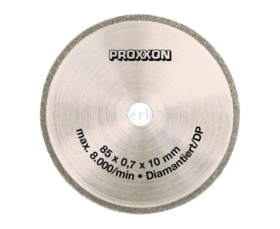 Изготовлен из стали с алмазным абразивом класса D100 и размером зерна 125/100 мкм. Посадочное отверстие имеет диаметр 10 мм, а толщина диска составляет 0.7 мм. Этот инструмент предназначен для быстрой и точной резки фарфора, керамики, камня, карбона, стекловолокна и печатных плат. Максимальная скорость работы достигает 8 000 об./мин. Диск совместим с настольной циркулярной пилой Proxxon FKS/E и KGS 80.