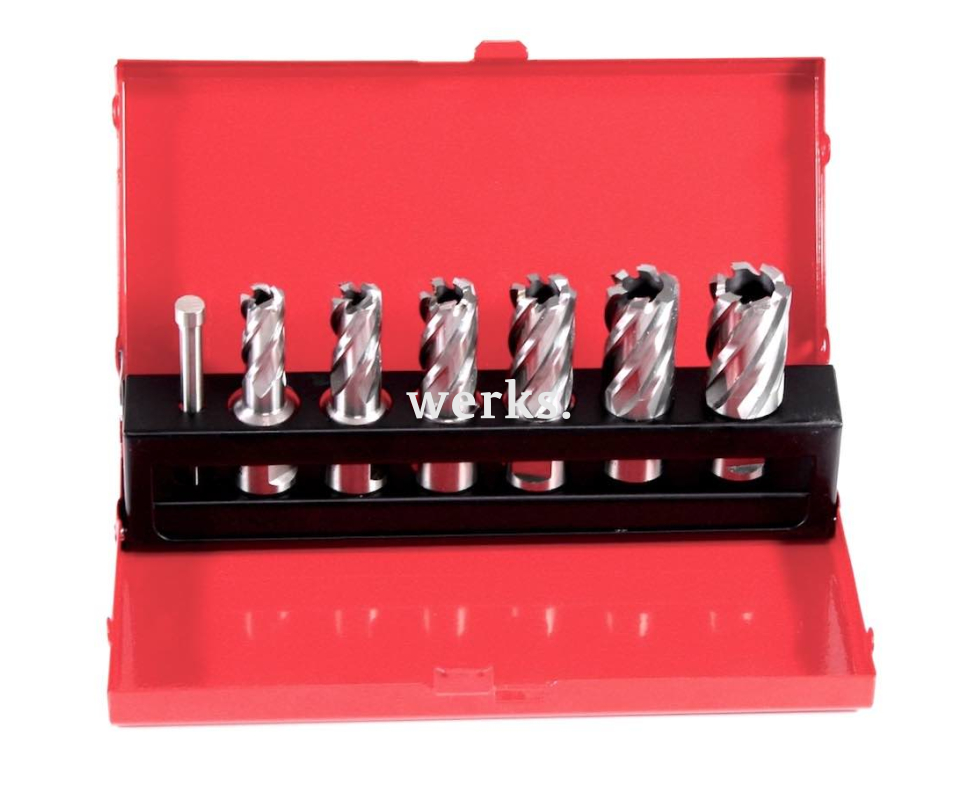 Комплект из 6 шлифованных корончатых сверл-фрез диаметром от 12 до 22 мм, а также штифта для извлечения высверленных частей. Изготовлены из высококачественной быстрорежущей стали HSS. Эти инструменты предназначены для создания точных отверстий в стали, литом металле, а также в цветных и легких сплавах. Оптимальный угол зубьев снижает нагрузку на материал, а правильно подобранный угол заточки обеспечивает универсальность и долговечность сверл. Центровка, черновое сверление и рассверливание не требуются. Рекомендуемая скорость сверления достигает 1592 об/мин, при этом необходимо использовать охлаждающие жидкости. Хвостовик Weldon 3/4' и глубина сверления 30 мм делают их идеальными для магнитных сверлильных станков. Длина сверла составляет 63 мм. Поставляется в металлическом контейнере, удобном для хранения и транспортировки.
