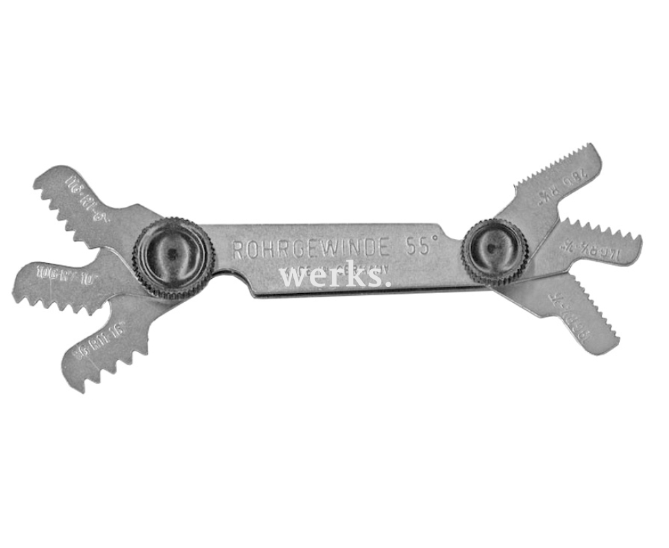 Практичный и высокоточный Шаблон для проверки резьбы BSP Schut 856.458 в комплекте из 6 штук, весом 15 г. Это универсальный набор для измерения размеров резьбы. Данный инструмент позволяет точно установить шаг и форму профиля резьбы. Он оснащен никелированной ручкой, в которой находятся шаблоны.