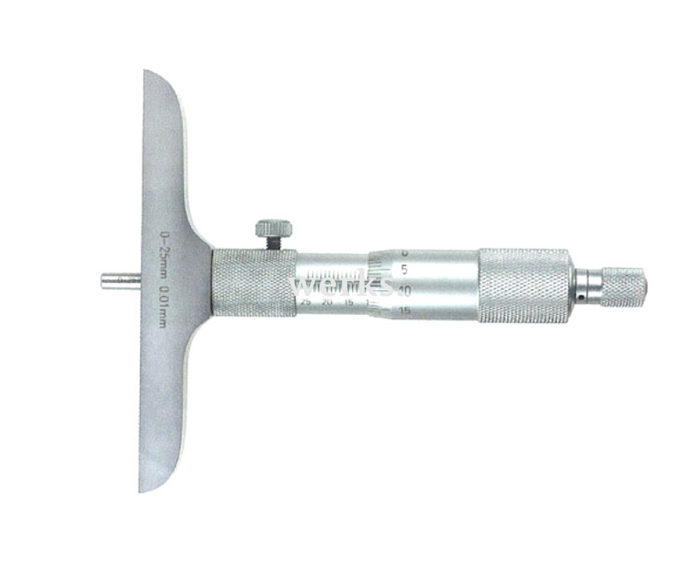 Цифровой микрометрический глубиномер с диапазоном измерений от 0 до 25 мм. Шаг измерения составляет 0,01 мм. Допустимая погрешность - +/-4 мкм. Размер основания равен 101,5 мм. 906.040