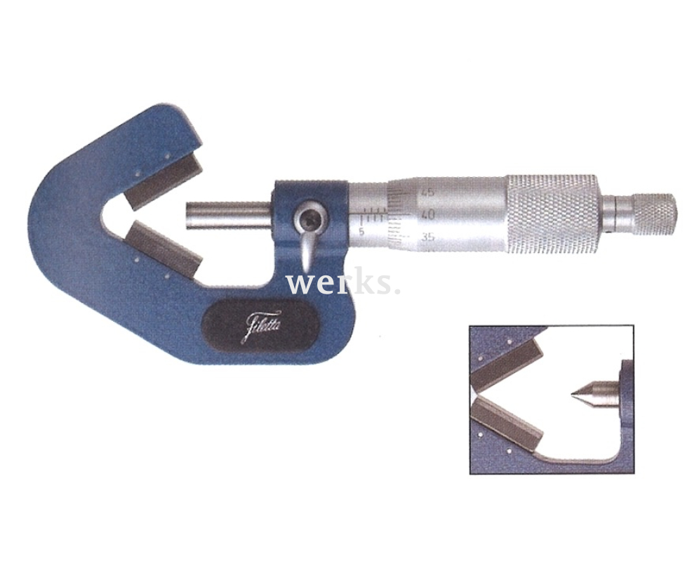 Для измерения деталей с тремя гранями под углом 60°. Диапазон измерений составляет от 1 до 15 мм. Шаг измерений равен 0,01 мм. Диаметр измерительной поверхности составляет 6,5 мм. Диаметр шпинделя также равен 6,5 мм. Погрешность измерений составляет +/-4 мкм. 906.160