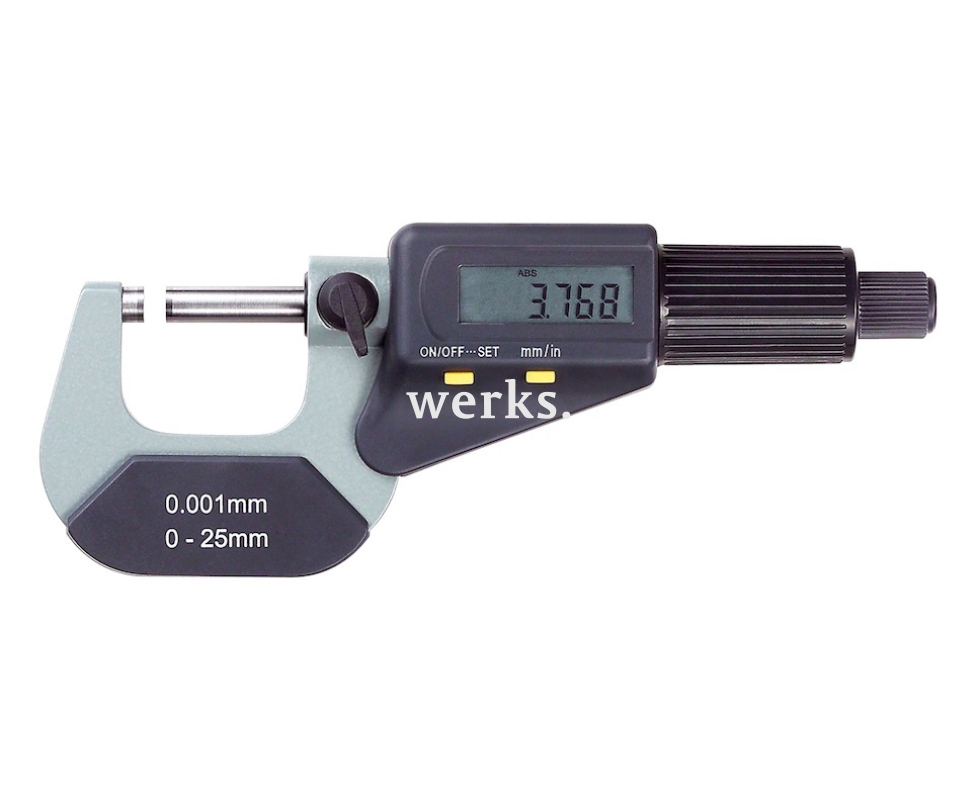 Изменение единиц измерения с миллиметров на дюймы. Диапазон измерений составляет от 25 до 50 мм. Шаг измерений равен 0,001 мм. Диаметр поверхности для измерений - 6,5 мм. Ошибка измерений составляет +/-4 мкм. 908.759