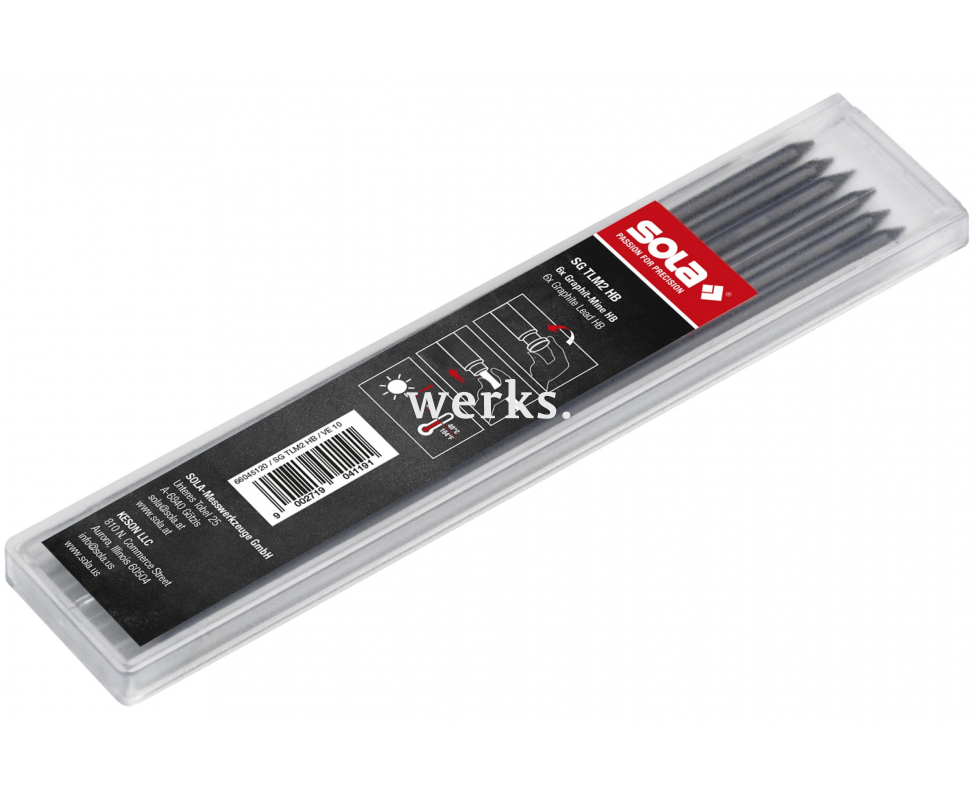 Шесть сменных графитовых стержней для карандаша Sola TLM2, с твердостью HB и длиной 12 см. Используются для разметки как сухой, так и влажной древесины, а также камня, кирпича, бетона, металла, плитки, бумаги и картона.