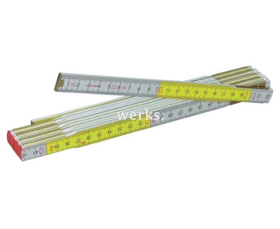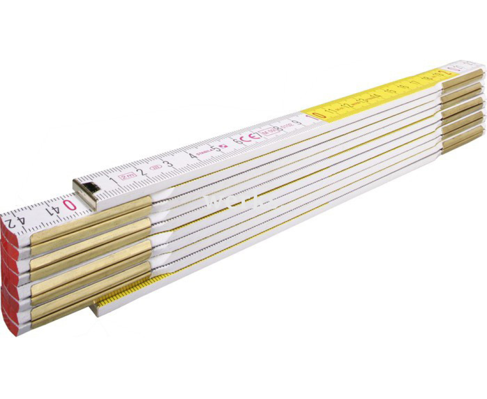 Изготовлен из качественного бука. Большие черные цифры обеспечивают легкость считывания; числа, кратные 10, выделены красным цветом. Шкала представлена в сантиметрах и миллиметрах с обеих сторон. Прочные шарнирные пластины обвивают деревянную рейку. Скрытые заклепки и пружины из закаленной стали гарантируют плавность движения и точность фиксации. Чередование белого и желтого цветов рейки происходит каждые 10 см. Класс точности: III Количество секций: 15 Толщина рейки: 3,3 мм Шкала: двусторонняя